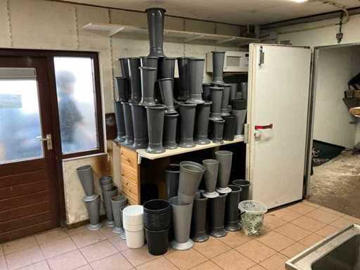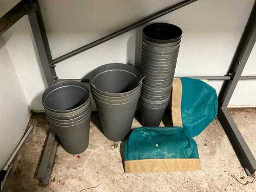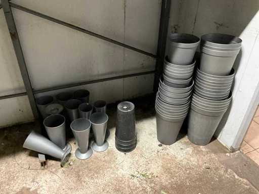 Bestaande uit: diverse kunststof emmers, stalen vazen en decoratie