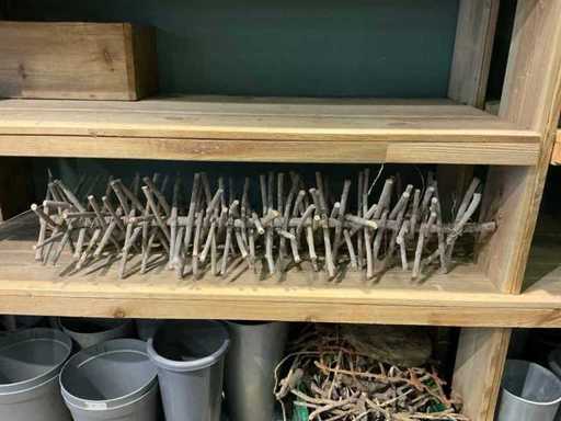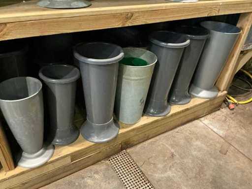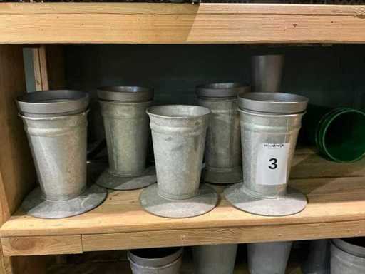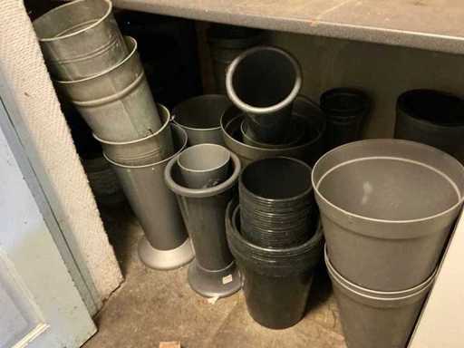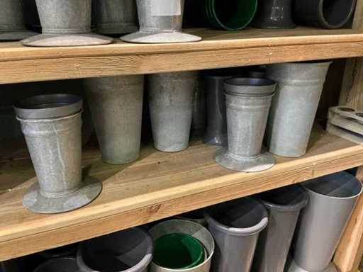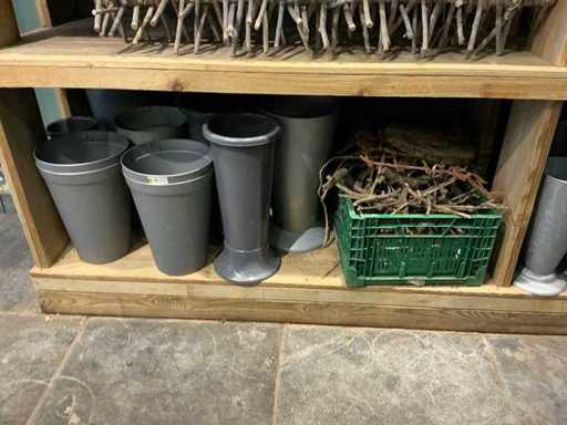 Bestaande uit: diverse kunststof emmers, stalen vazen en decoratie. Let op: zonder stelling