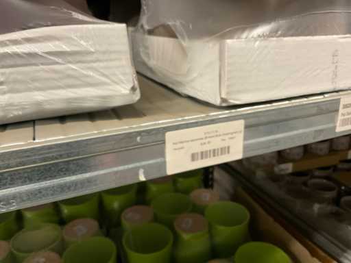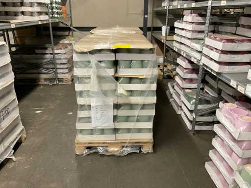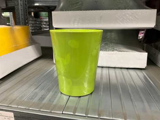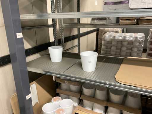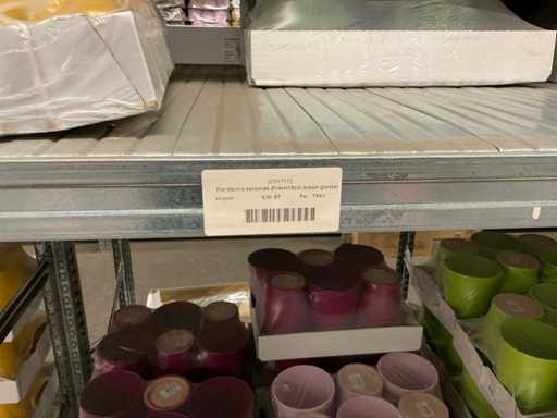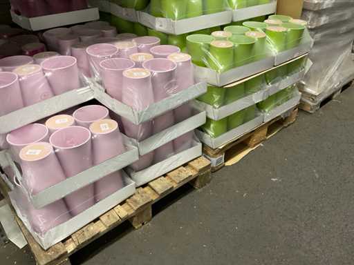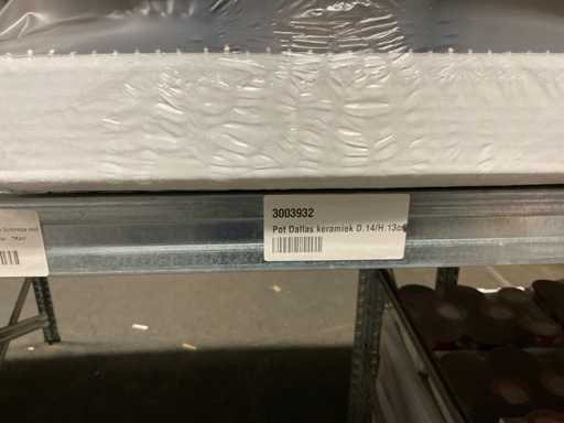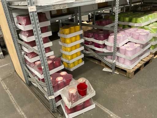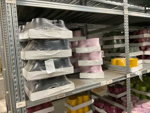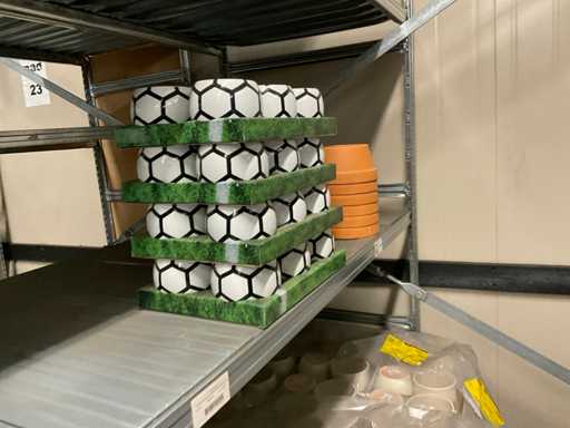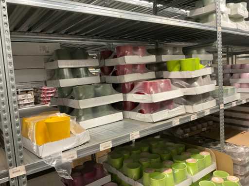 Inhoud van 2 zijden van stelling en op pallets bestaande verschillende maten en kleuren stenen potten, exclusief stelling, inclusief pallets.