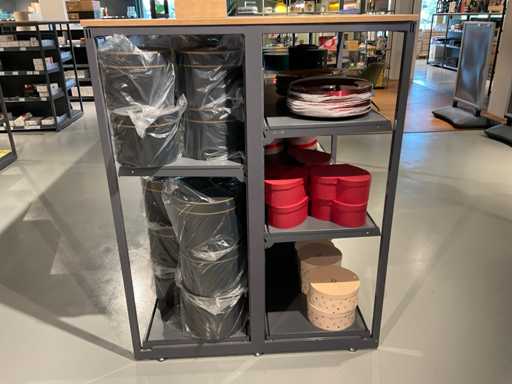 Inhoud van stelling, bestaande uit diverse soorten en maten geschenkdozen, en decoratieborden. Exclusief stelling.