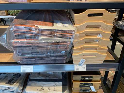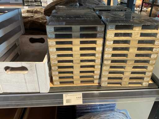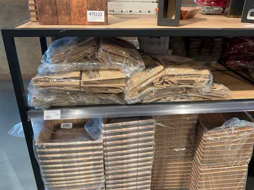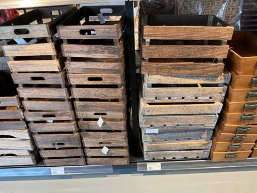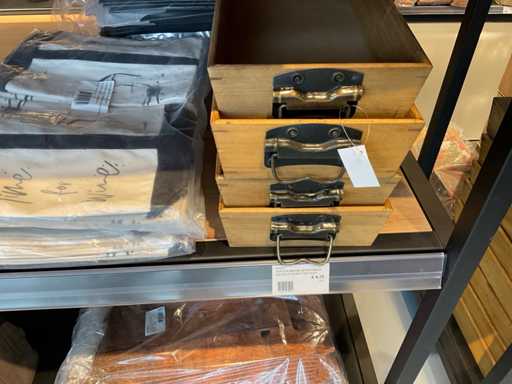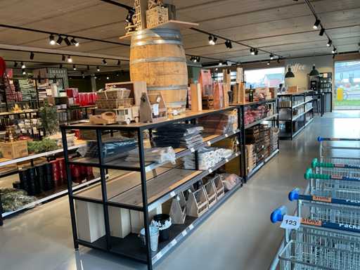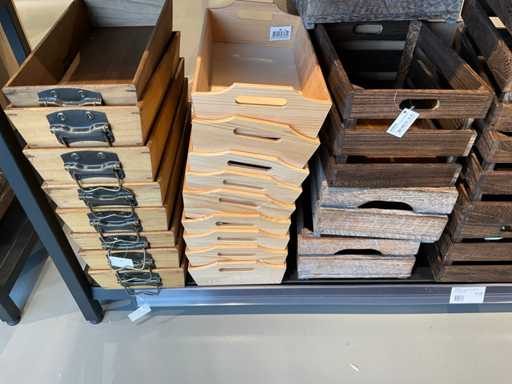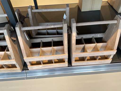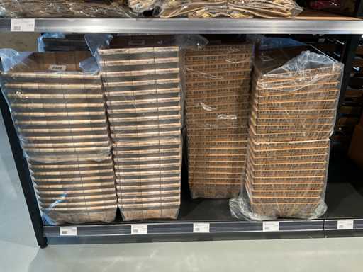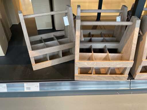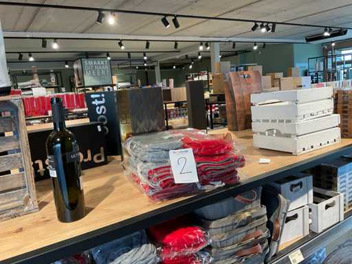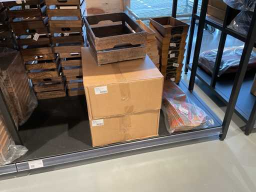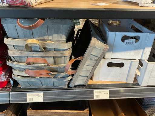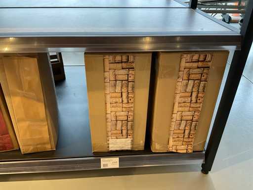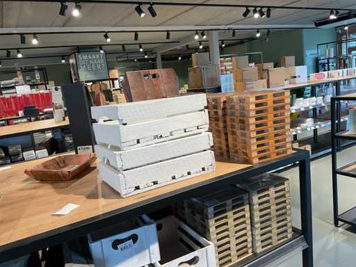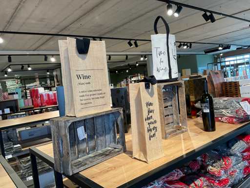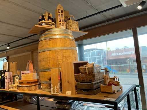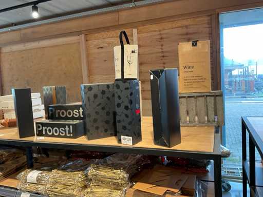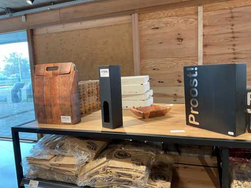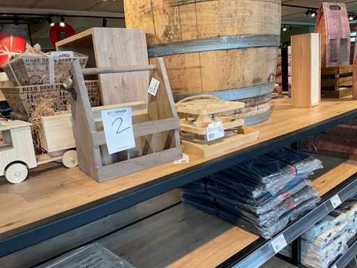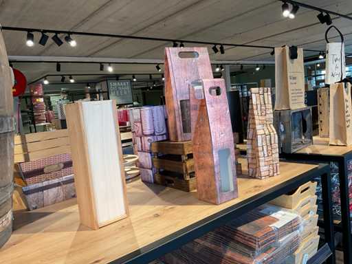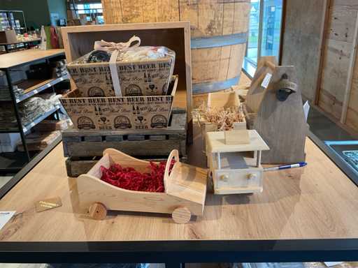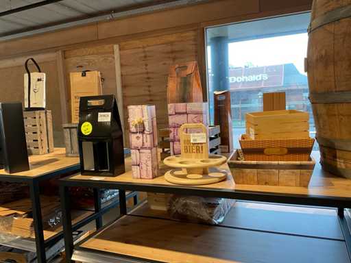 Diverse soorten cadeauverpakkingen, waaronder houten palletjes, kratjes, mandjes, wijntassen en zakken etc. Inclusief decoratie op bovenste deel en biervat, exclusief stelling.