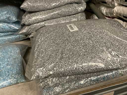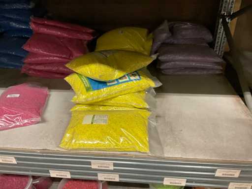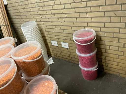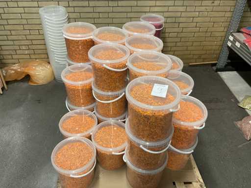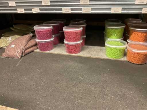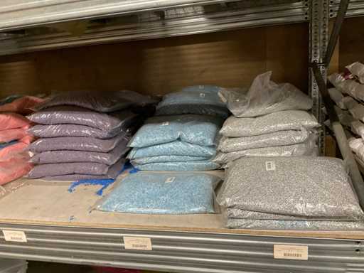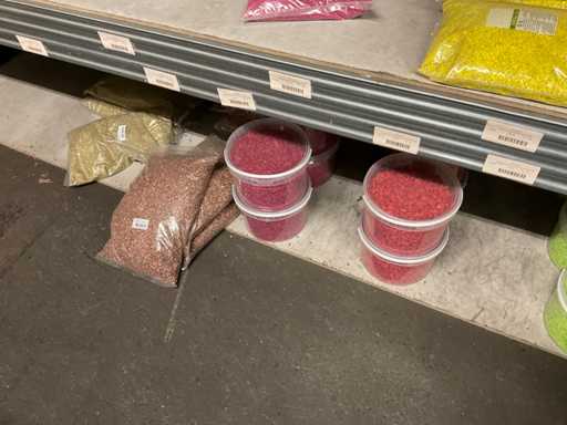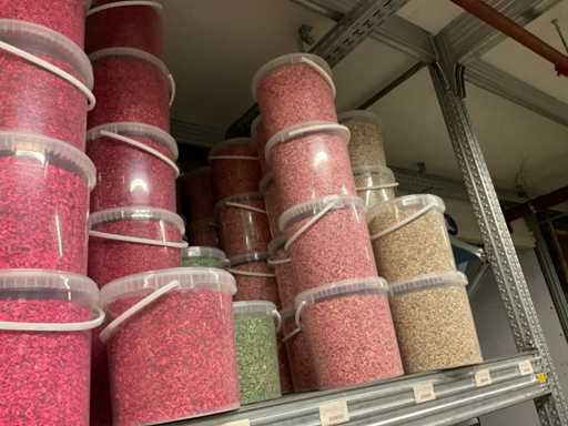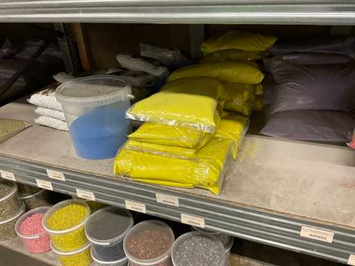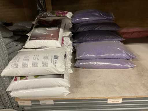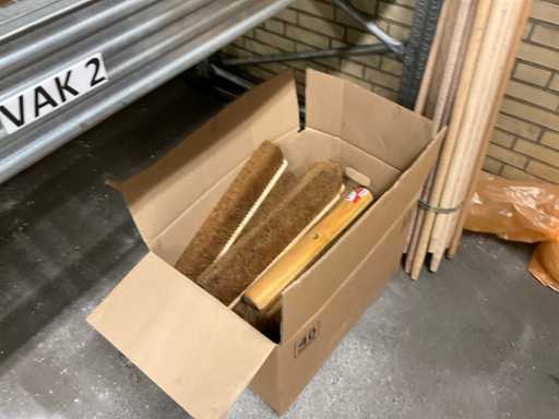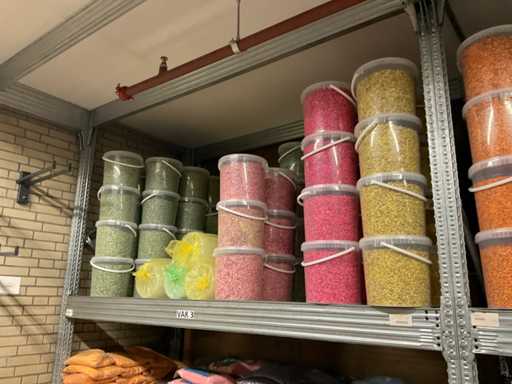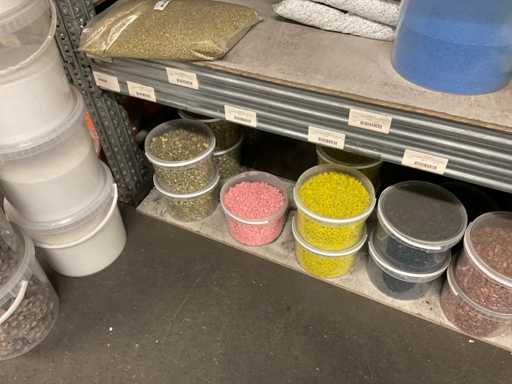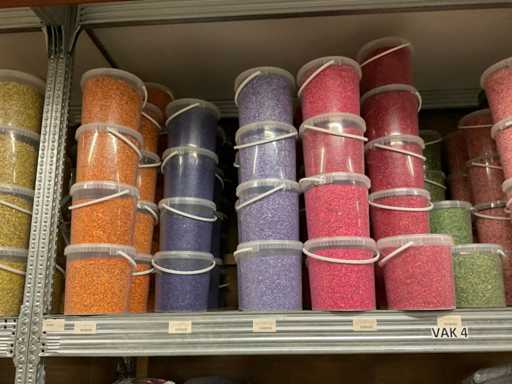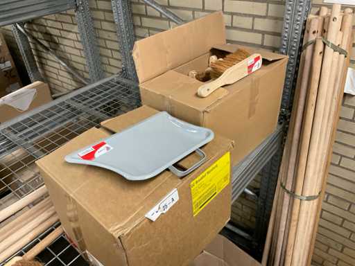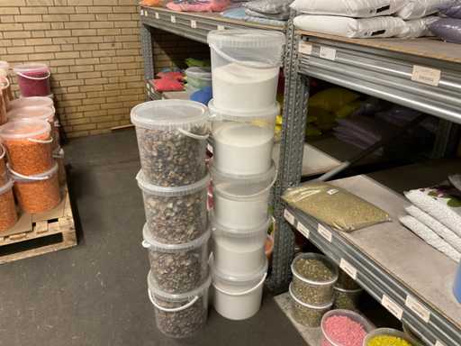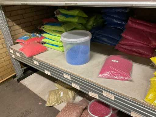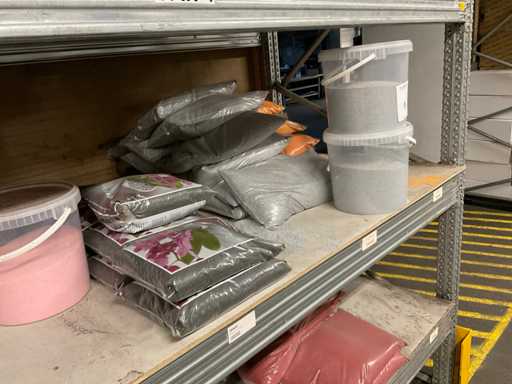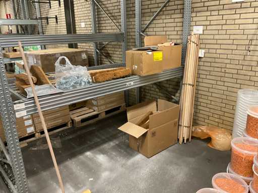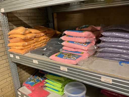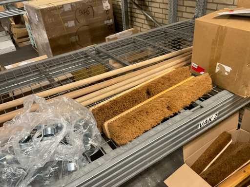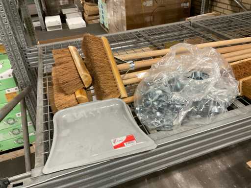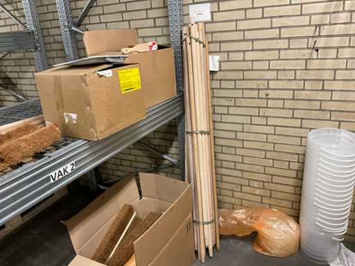 Inhoud van 2 zijdes van stelling bestaande o.a. uit decoratiezand, schelpen, houtsnippers, bezems en stoffer en blik, exclusief stelling