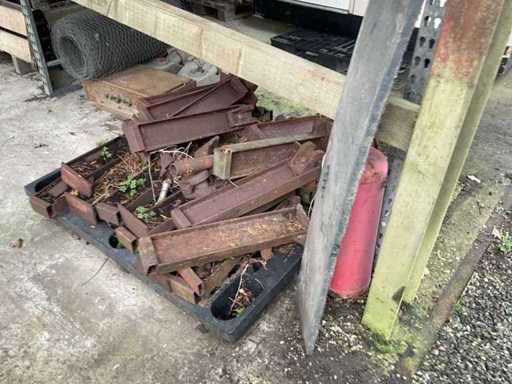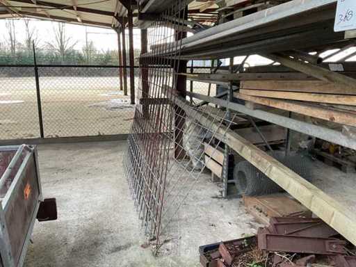 Waaronder houten balken, stalen buizen. In en inclusief magazijnstelling 450x80x260cm en draagarmen links. De draagarmen dienen gedemonteerd te worden, staanders niet inbegrepen.