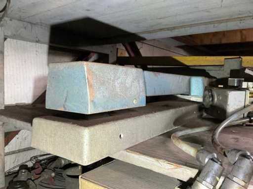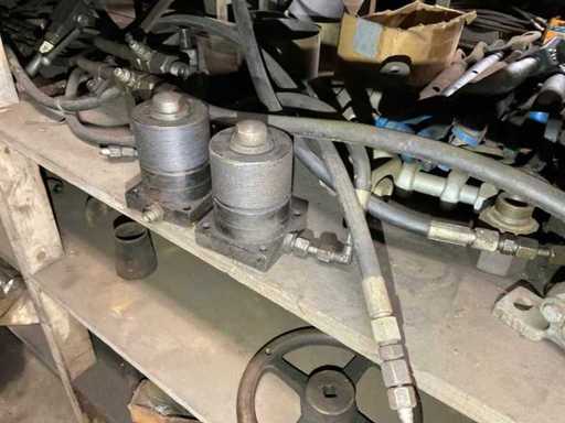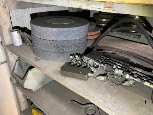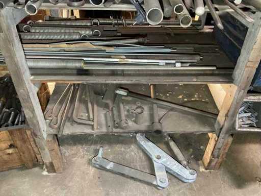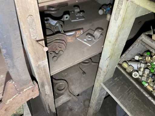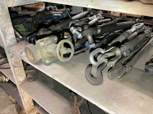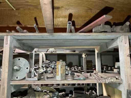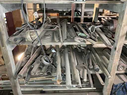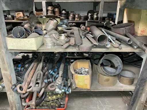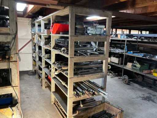 Waaronder spanijzers, speciaal gereedschap, ruimers, hydraulische cilinders, gereedschapskisten, bankschroef, hydrauliek pompen, etc. In en inclusief houten legbordstelling afmeting lxbxh circa 400x75x199cm