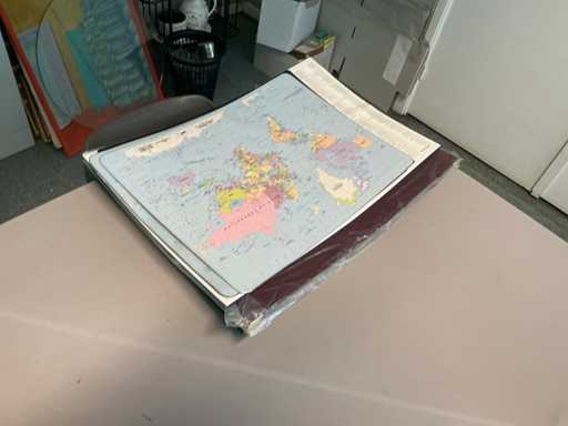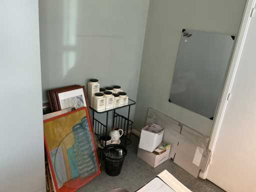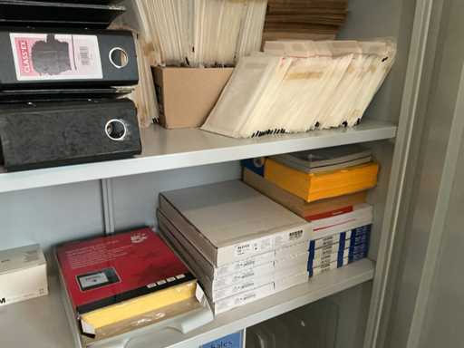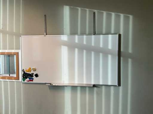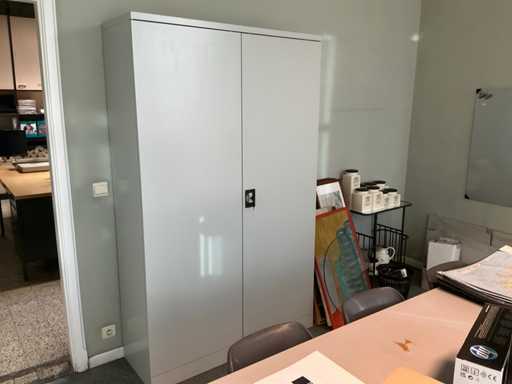 Bestaande uit , hoekopgesteld bureau, 1 bureaustoel, 1 x 2-deurs archiefkast, whiteboard, 3 stapelbare stoelen, diverse decoratie