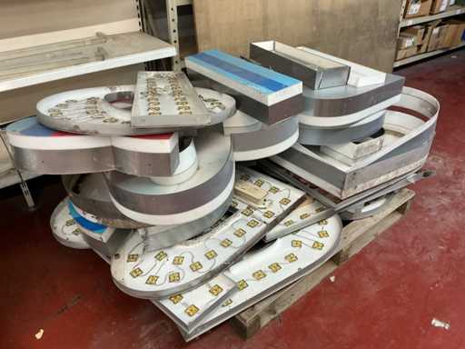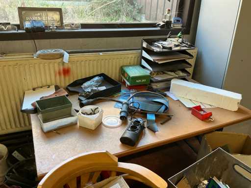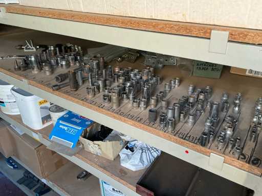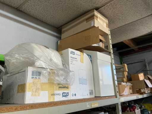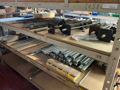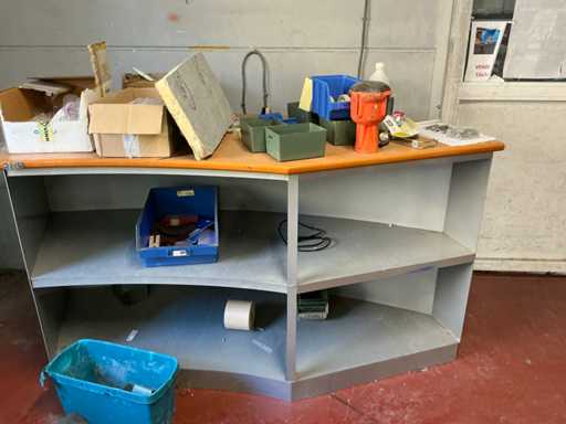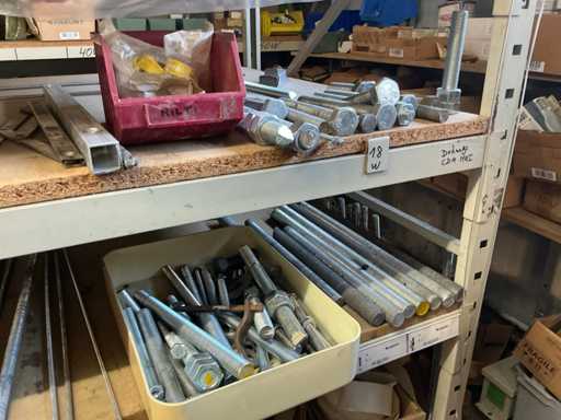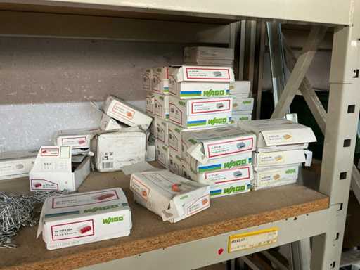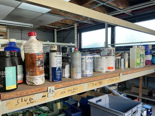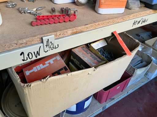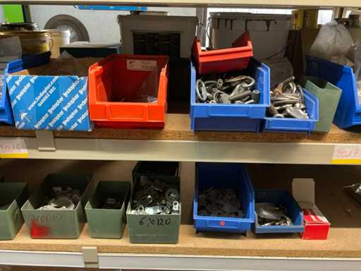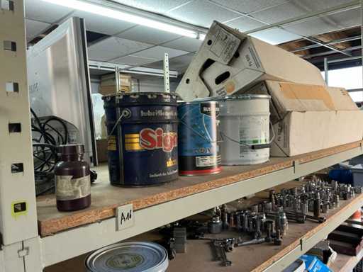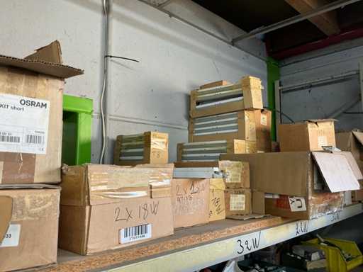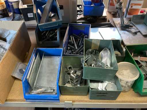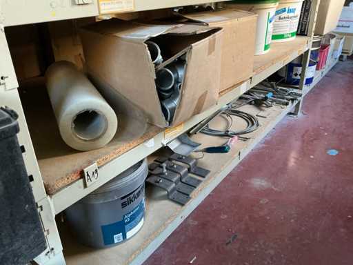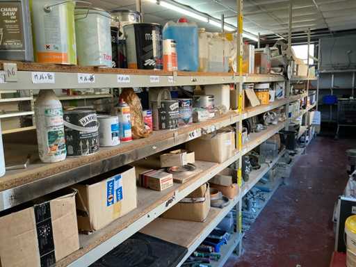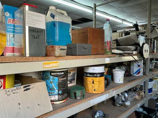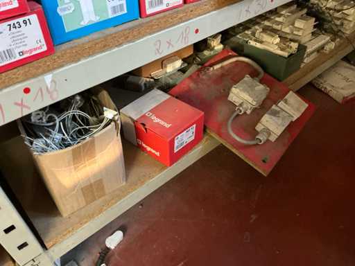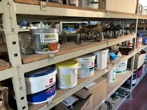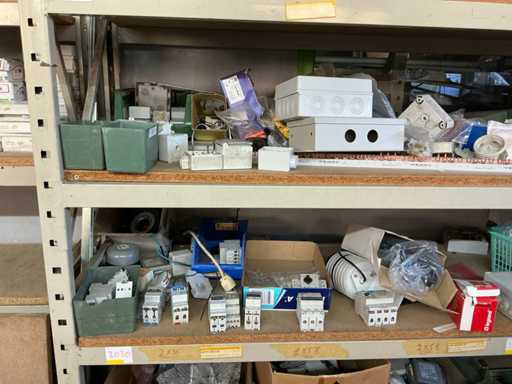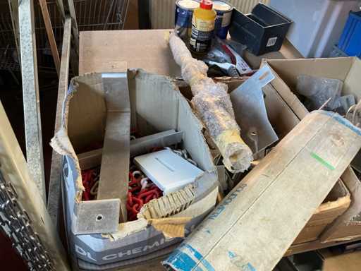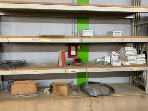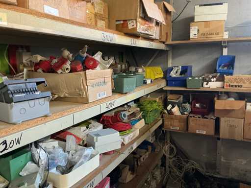 Waaronder diverse Wago-klemmen, diverse schakelaars en onderbrekers, magazijnlampen, diverse elektrokabels en installatiekabels, diverse verlichting waaronder Philips, Osram, partij diverse draadstangen, diverse klemmen, partij lastoebehoren waaronder lasdraad, partij diverse gegalvaniseerde bochten en koppelstukken, afstandshouders, diverse sloten en deurbeslag, partij dopsleutels, verfborstels en kwasten, zwenkwielen, partij lakken, vernis en verf waaronder aangebroken, compleet met houten baliemeubel, bureautafel en dossierkast, uitgezonders genummerde loten en rekken