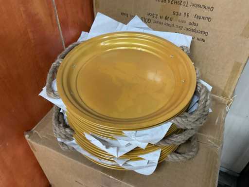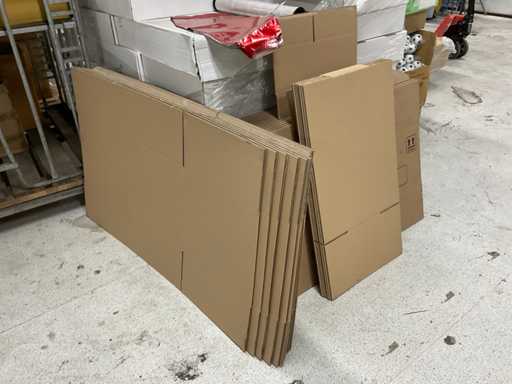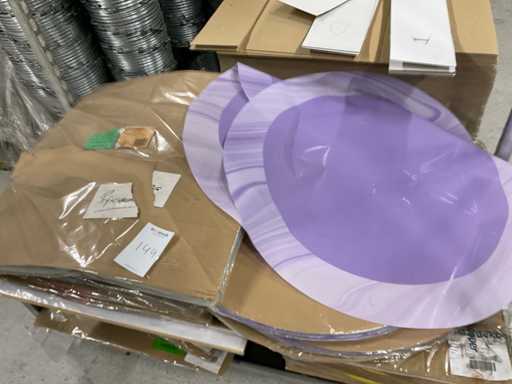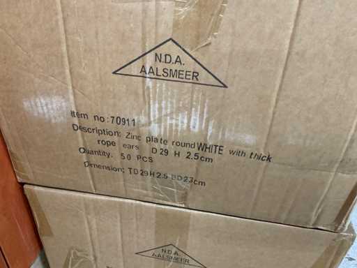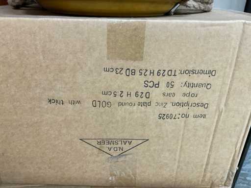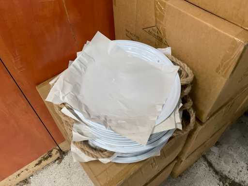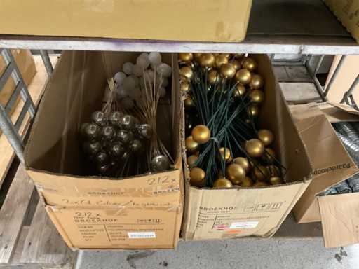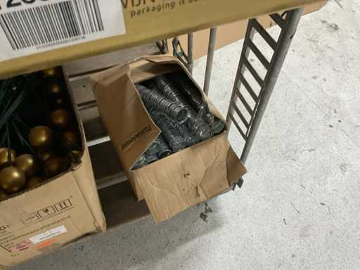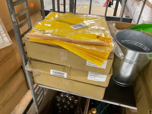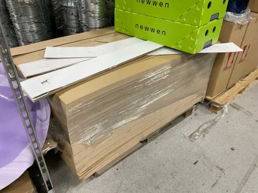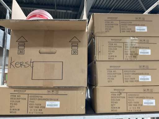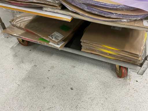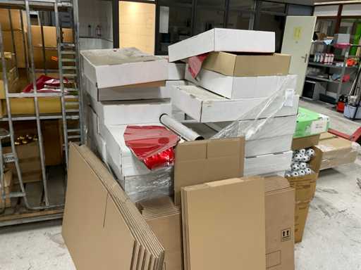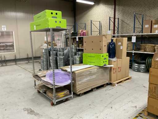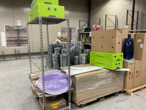 Bestaande uit pallet karton, Deense kar met vellen, bloemhoezen rood op pallet, dozen, instellers, tassen in 5 dozen, decoratieve borden, exclusief kar.