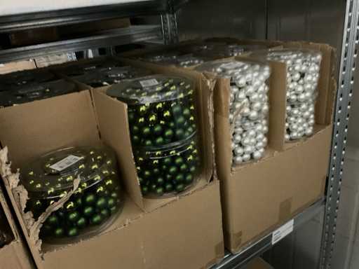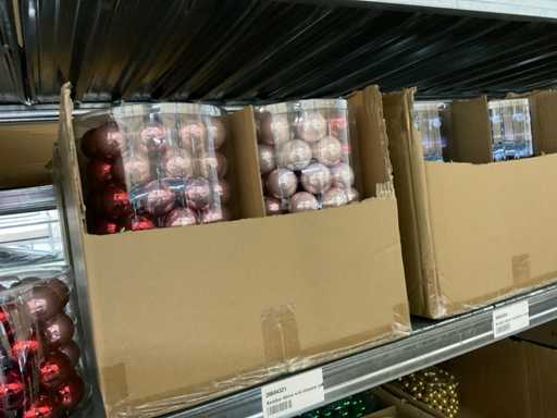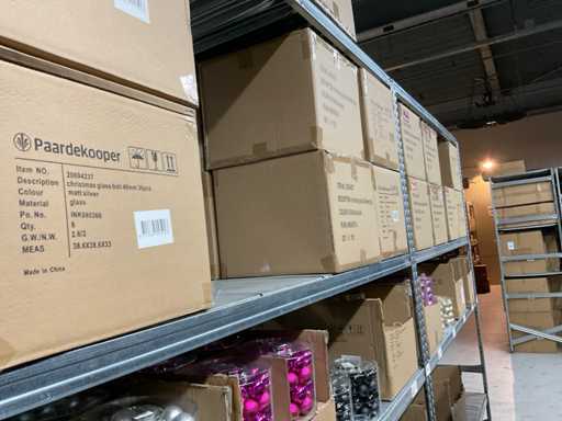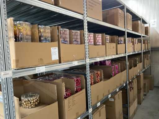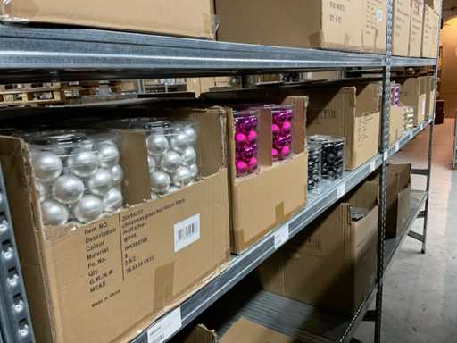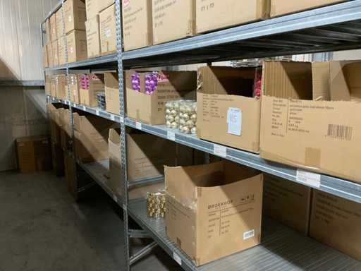 Inhoud van 2 zijden van stelling bestaande uit allerlei maten en kleuren kerstballen, exclusief stelling.