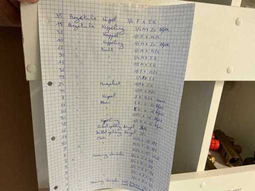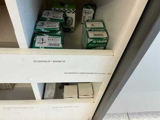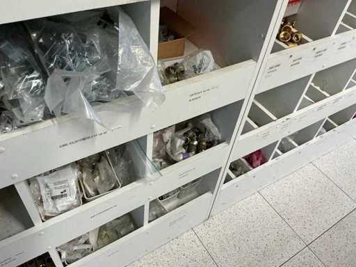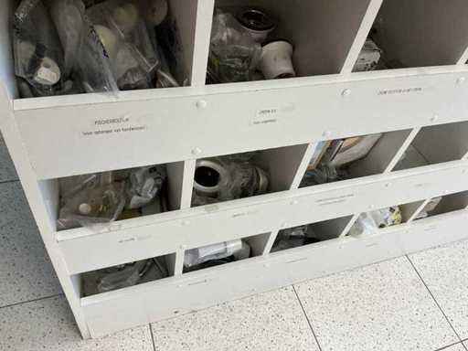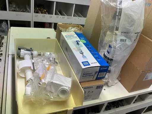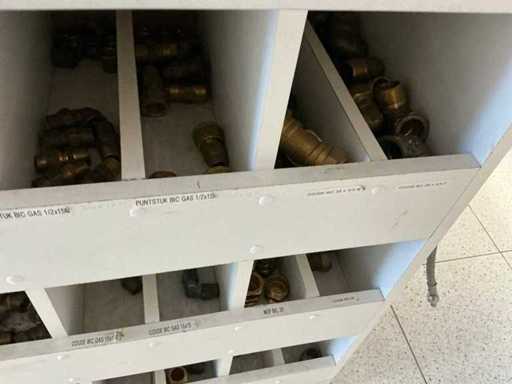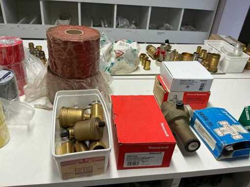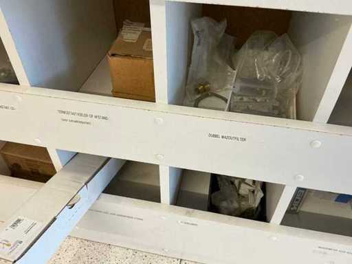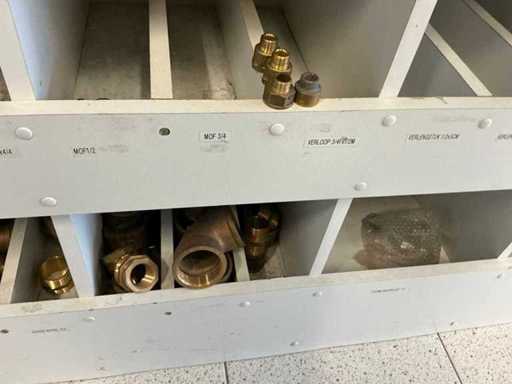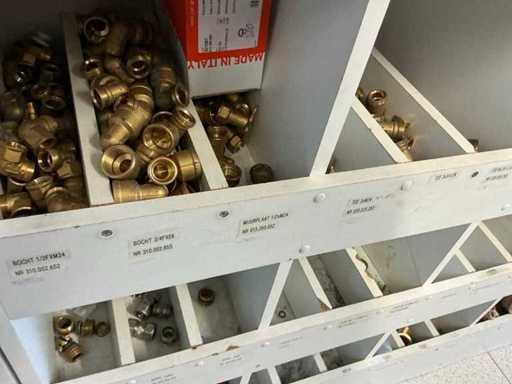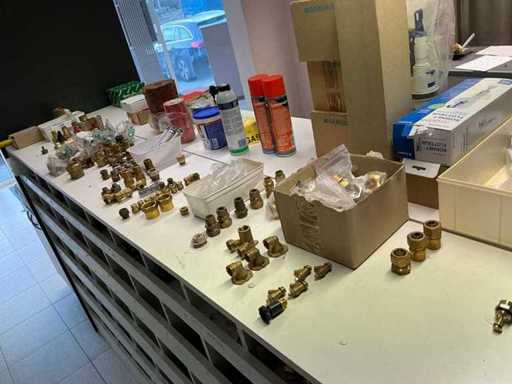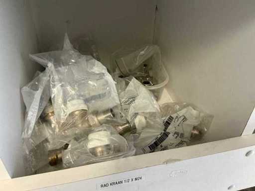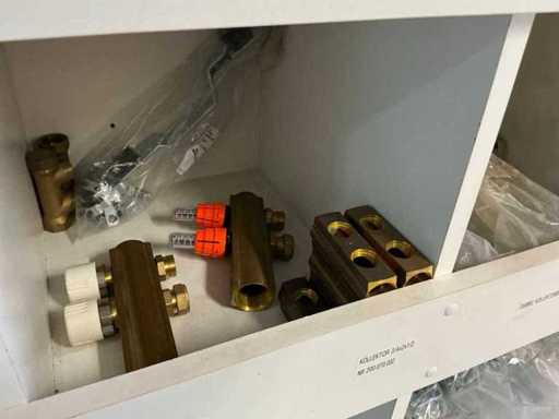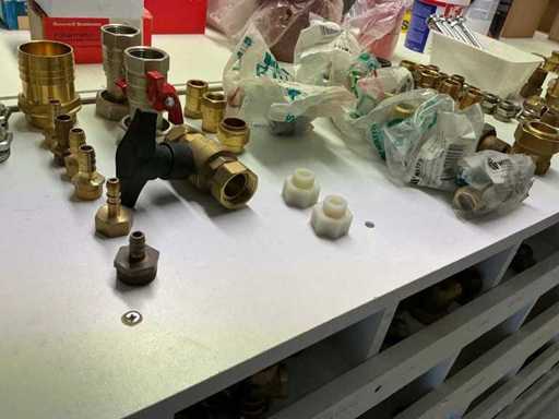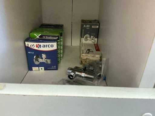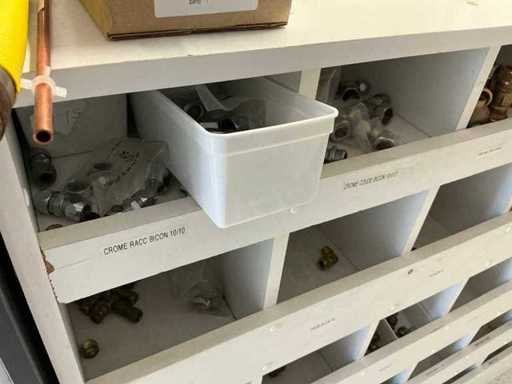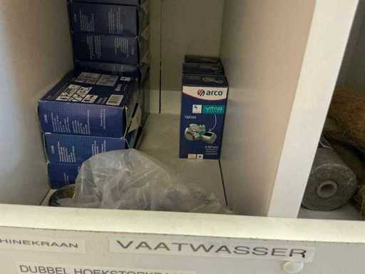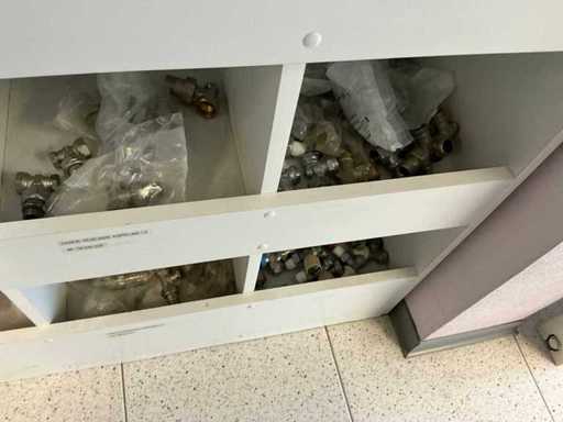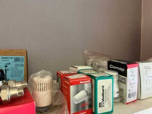 Waaronder koppelingen en overgangen, radiatoraansluitingen, Geberit afvoeronderdelen, Geberit sifons, lekzoekspray, flexslangen, kranen, afdichtingstape, radiatorthermostaatknoppen, beugels,ontluchters,….. inhoud zie foto’s.