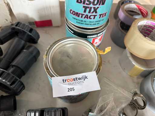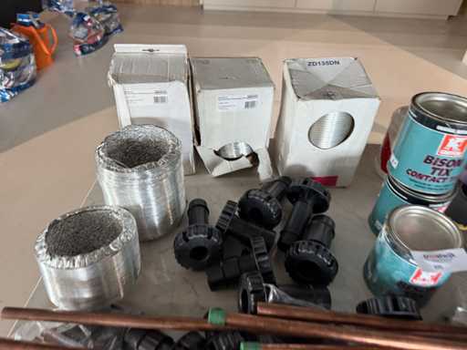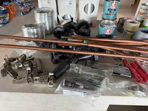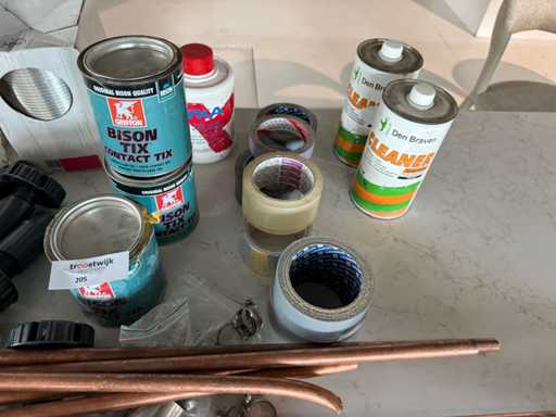 Bevat diverse koperbuizen; metalen koppelingen en fittingen; blikken lijm en reiniger (o.a. Bison Tix, Griffon); rol tape; flexibele metalen slangen; diverse kleine onderdelen en bevestigingsmaterialen