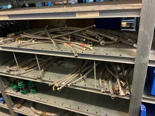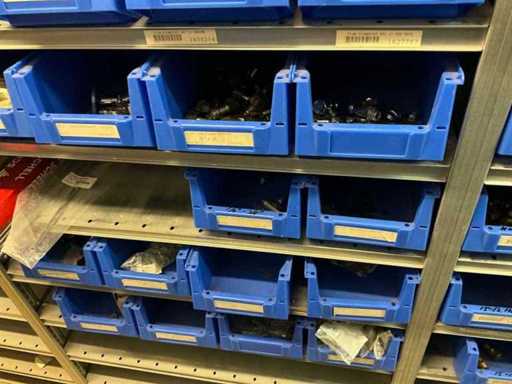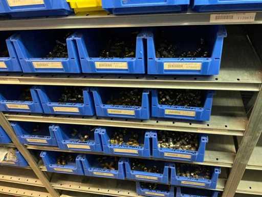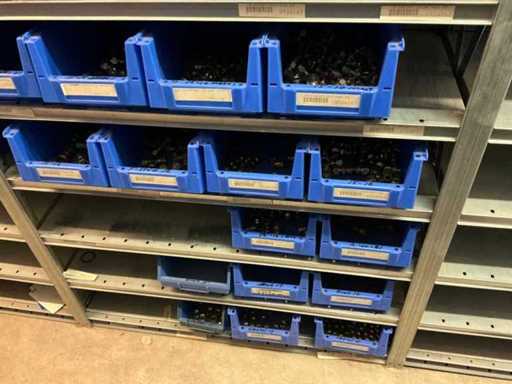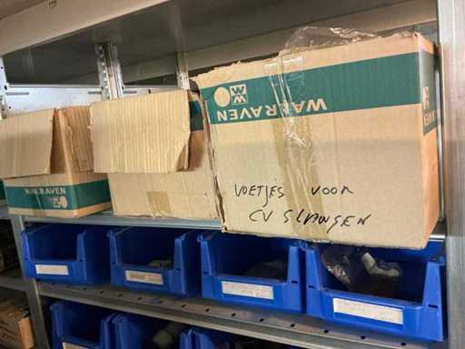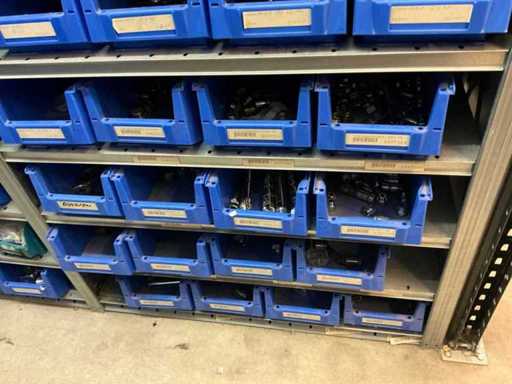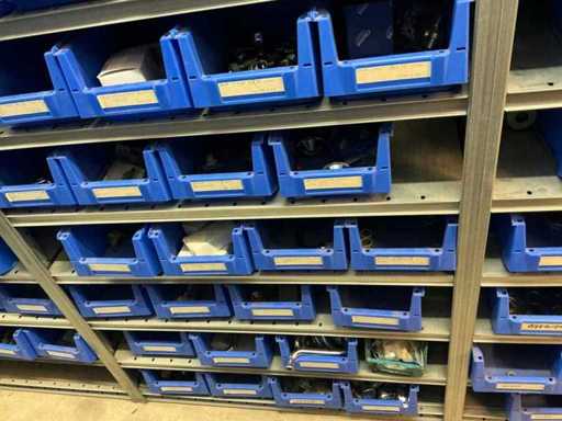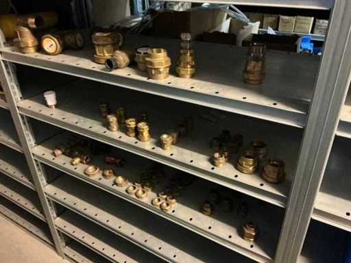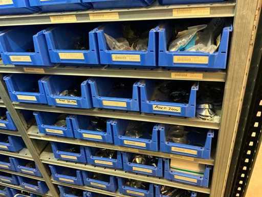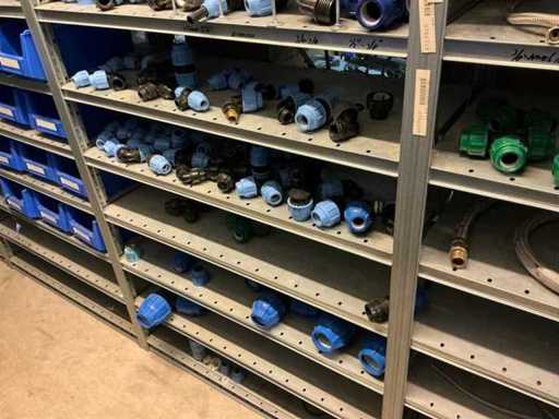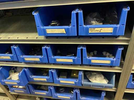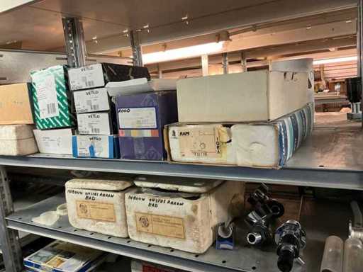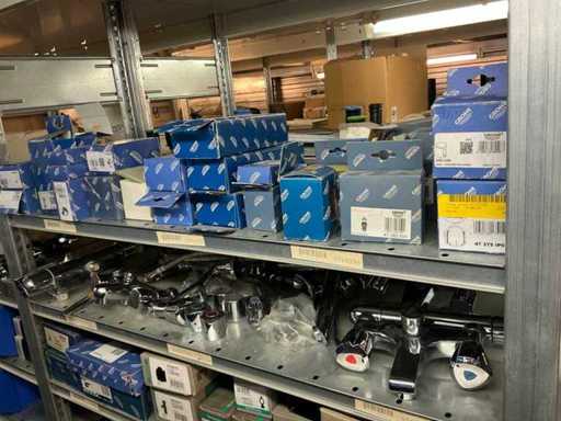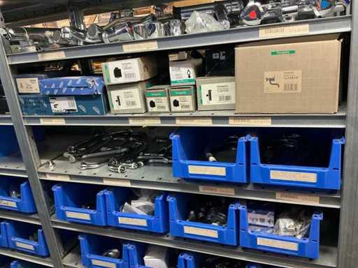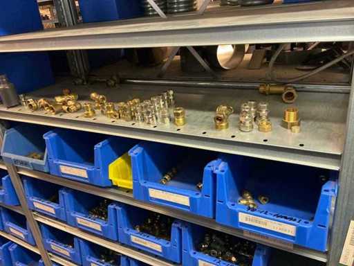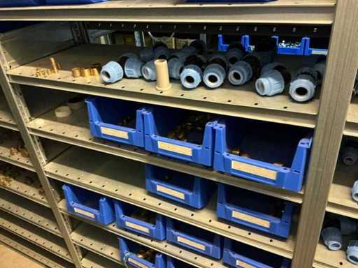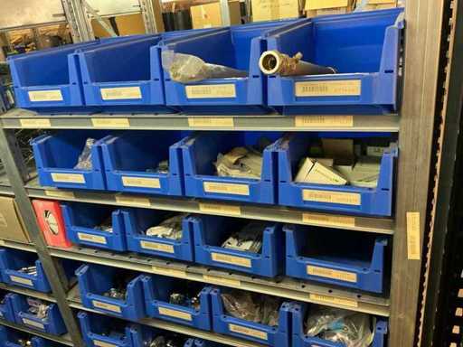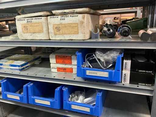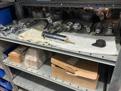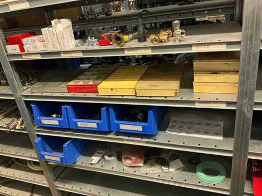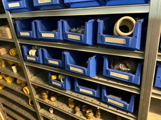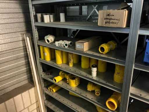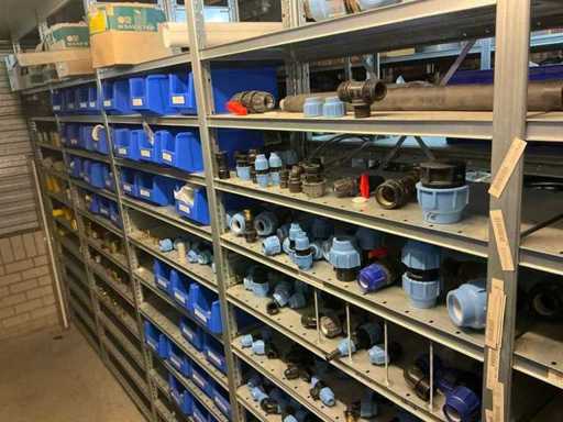 Bestaande uit inhoud circa 12 meter legbordstelling 50 cm diep. Onder andere: kranen, koppelstukken, leidingen, en divers ten behoeve van sanitair, inclusief magazijnbakken. Stelling niet inbegrepen.