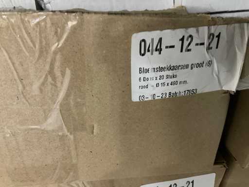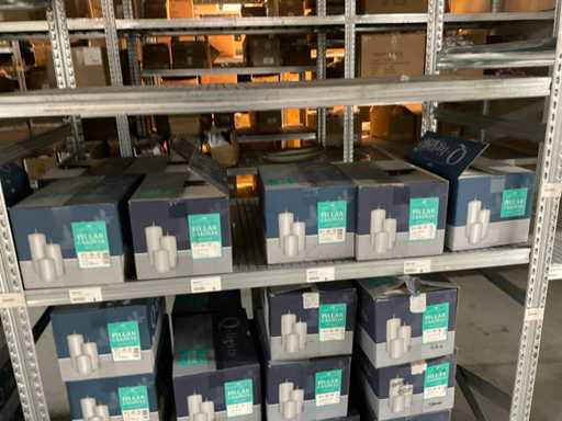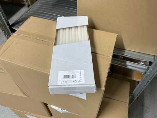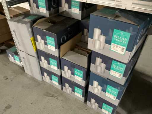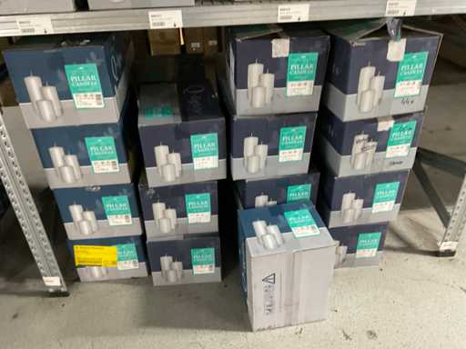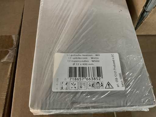 Inhoud van 1 zijde van stelling bestaande uit allerlei maten en kleuren kaarsen, exclusief stelling.