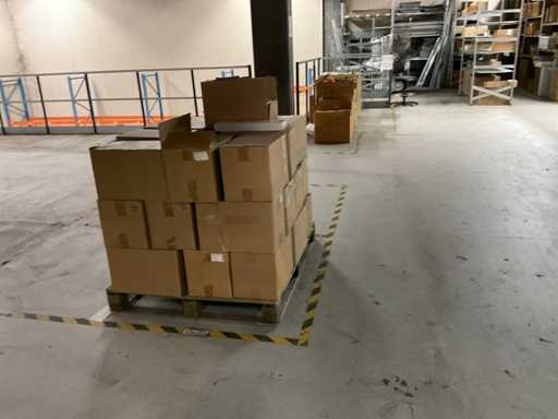 Let op kavels liggen op 1ste verdieping, enkel met trap bereikbaar, goederen met lift max 400 kilo of per pallet met vorkheftruck naar beneden te halen.