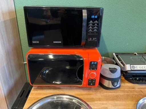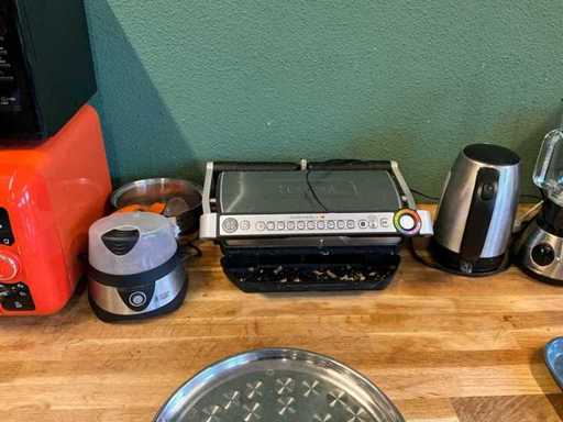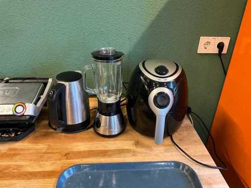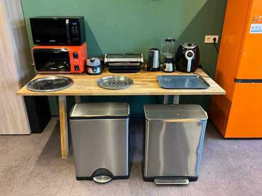 Waaronder: 2x magnetron, eierkoker, contactgrill, waterkoker, blender, friteuse, 3x dienblad , 2x afvalbak, op en inclusief houten tafel ( 90x180x75cm)