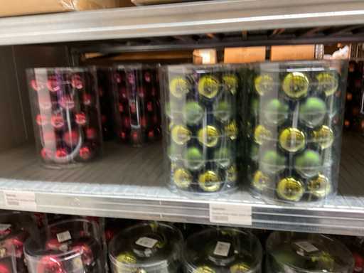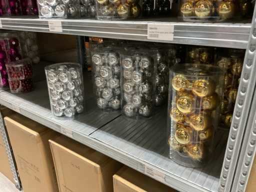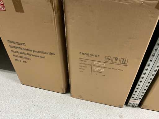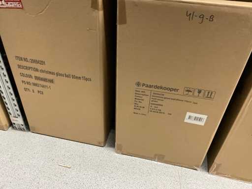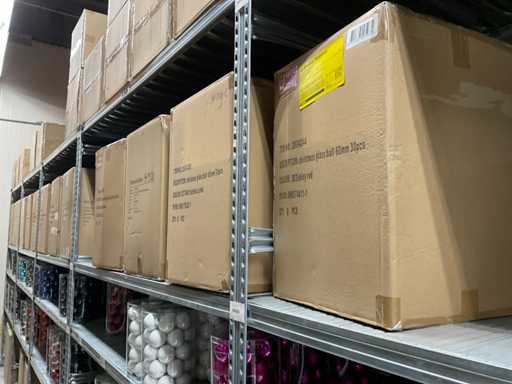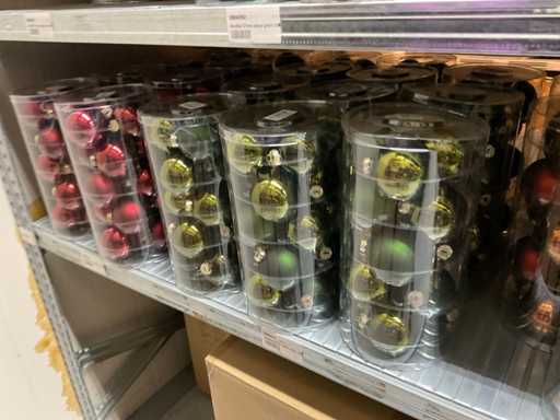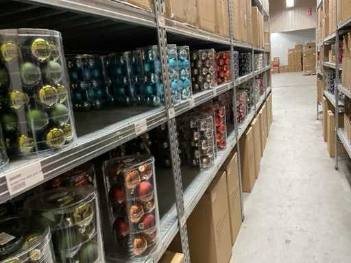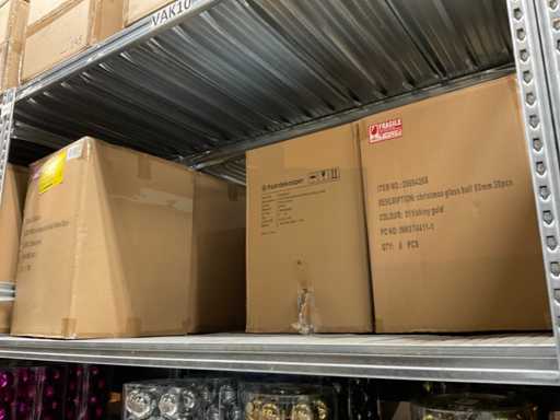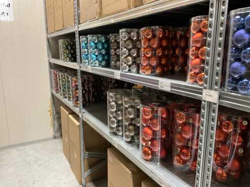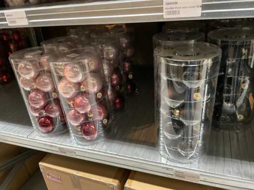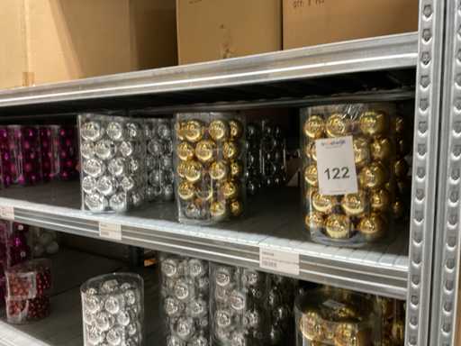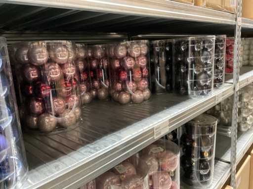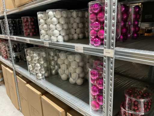 Inhoud van 1 zijde van stelling bestaande uit verschillende maten en kleuren kerstballen, exclusief stelling.
