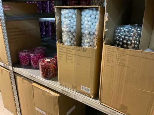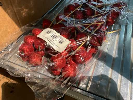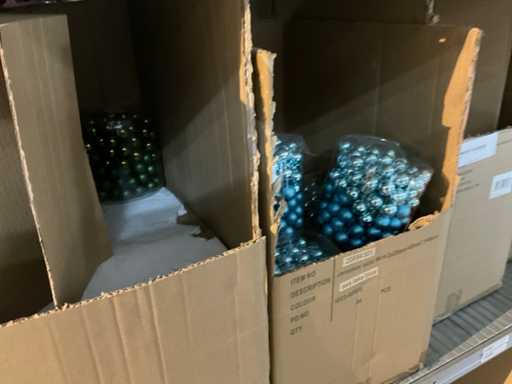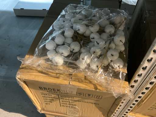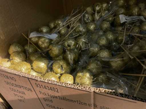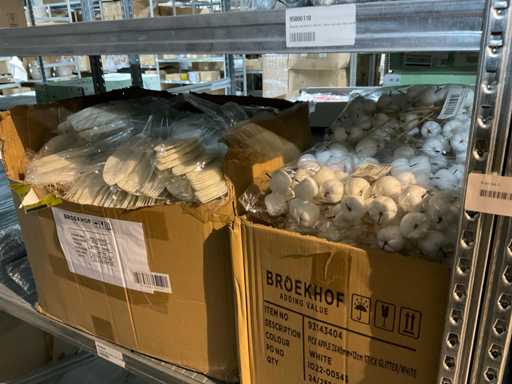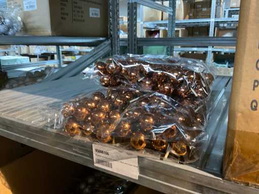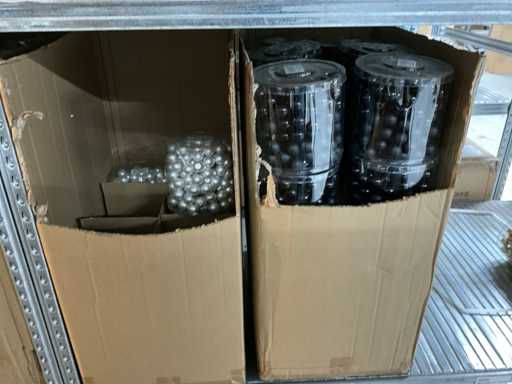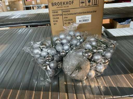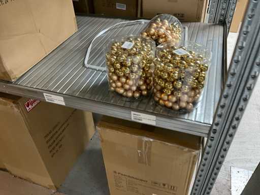 Inhoud van 2 zijdes van stelling bestaande uit verschillende maten en kleuren kerstballen bijstekers en engelenhaar, exclusief stelling.