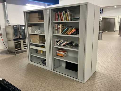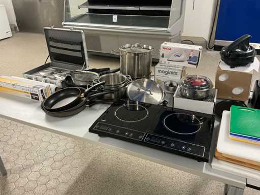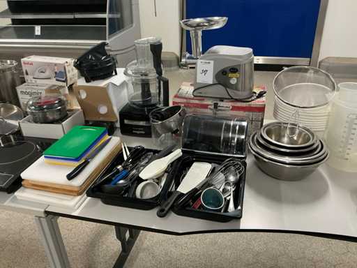 Waaronder messen, glaswerk, schalen, keukenmachine, snijplanken, kookplaat, pannen, etc,op 2 tafels, inclusief 4 kasten met inhoud en 2 tafels
