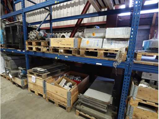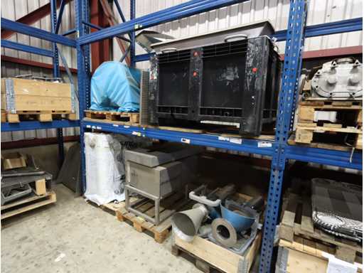 En toebehoren, waaronder transportbanden, kettingtransport, motor, bakken, ventilatoren, trayvormen, installatiemateriaal, etc, uit 10 secties stelling, en op vloer achter hek