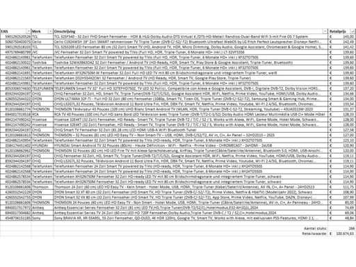 Dit betreft een partij televisie retourgoederen van een grote online retailer. De partij bestaat uit televisies. Aantal stuks: 266. Retailwaarde: €100.674,- Ongecontroleerd: De televisies zijn niet werkend en het bestaat uit een mix van incompleet, beschadigd, te gebruiken