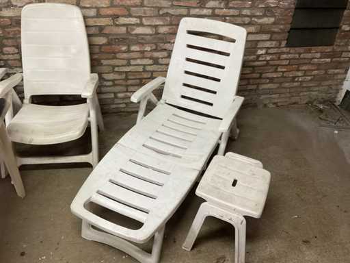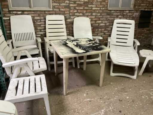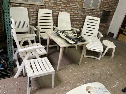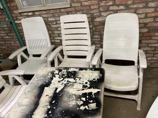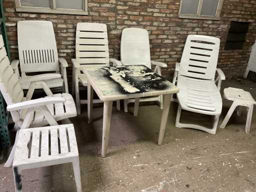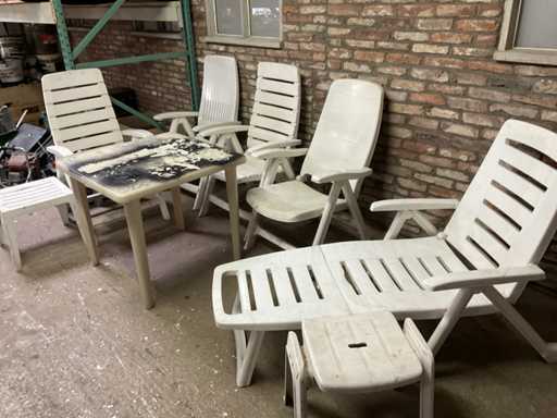 4x tuinstoel, 2x bijzet tafel, 1x eettafel, 1x ligstoel. Gebruikt