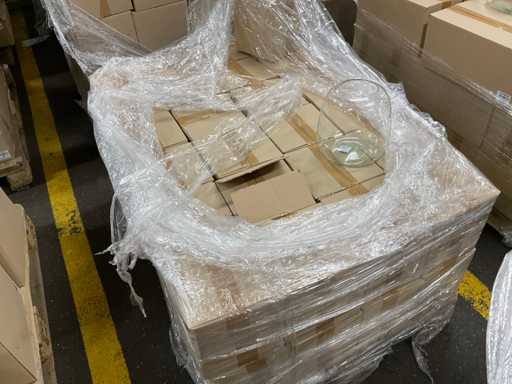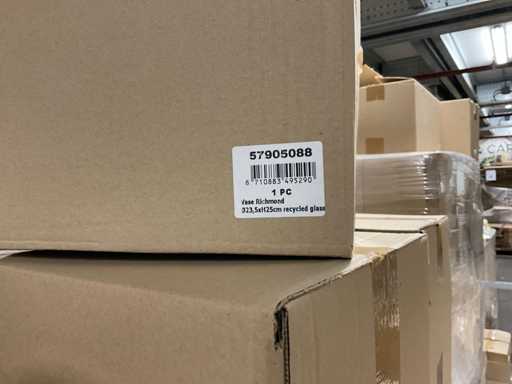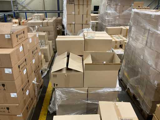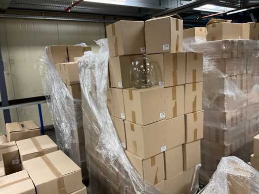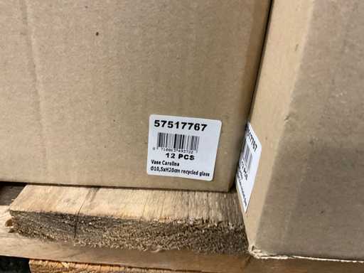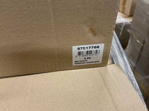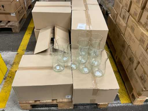 Inhoud op 5 pallets bestaande uit verschillende soorten glazen vazen verschillende formaten, inclusief pallets.
