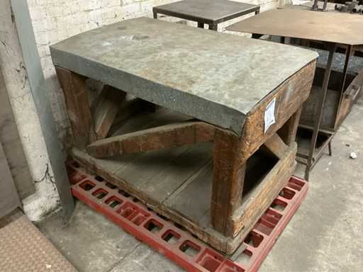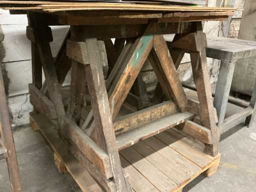 2 zware vintage houten schragen en 1 zware vintage houten werkbank voorzien van metalen bovenblad