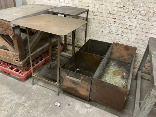 3 diverse metalen gereedschapstafeltjes waaronder hoogte circa 93 cm,