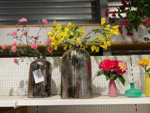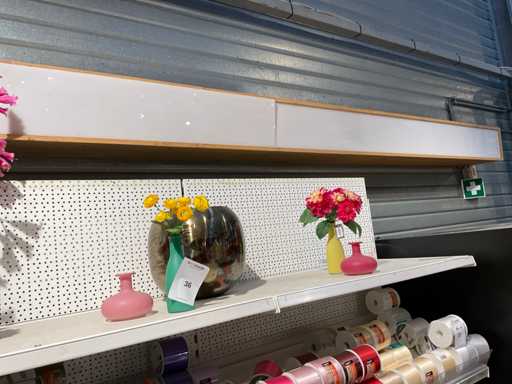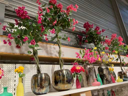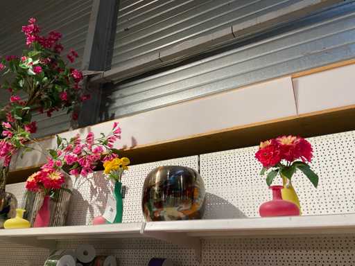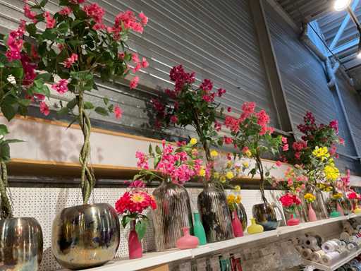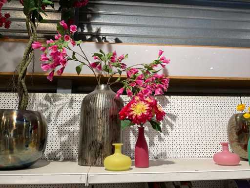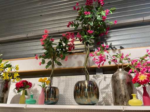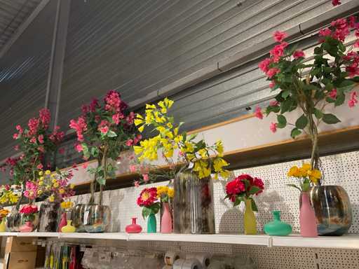 Vaasjes, kunstplanten in pot. Inhoud van bovenste plank stelling, exclusief stelling.