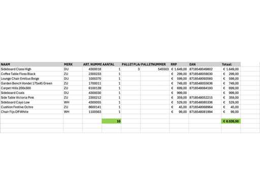 Bestaande uit merken: Zuiver, White label living, Dutchbone, Housecraft living. Op 1x XL pallet, transport afmeting circa: 2300x1200x1900 mm, betreft A-grade retour artikelen.