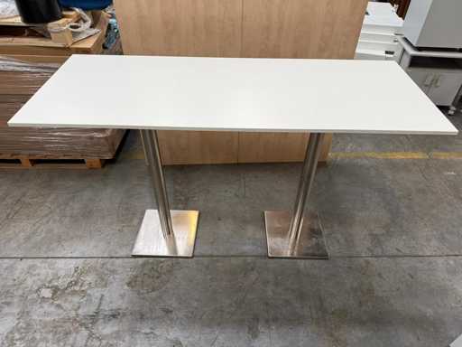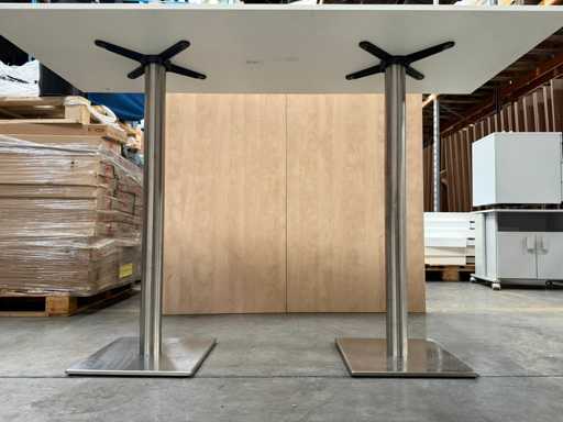Stevige hoge tafel / bartafel met wit werkblad en een robuust RVS (inox) onderstel met twee kolompoten op brede voetplaten. Geschikt voor horeca, refter, kantine, events of als hoge overlegtafel. Neutrale uitstraling en makkelijk combineerbaar.