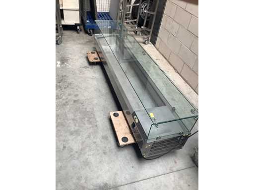 Je kunt volop verse, gekoelde ingrediënten voor je gerechten kwijt in de acht 1/3 GN-bakken die deze 1800 mm opzetvitrine kan herbergen. De glazen top zorgt ervoor dat je klanten kunnen zien wat je te bieden hebt, zodat ze eventueel zelf hun keuze kunnen maken. De behuizing van de vitrine is vervaardigd uit hoogwaardig rvs, dat een professionele uitstraling heeft en eenvoudig schoon te maken is, net als de glazen top. Het koelbereik van +2 tot +8 graden wordt gewaarborgd door een statische koeling.