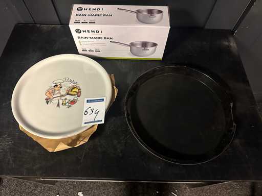 Bestaande uit twee pizza bord met tekening twee pizza bord zonder tekening een dienblad lichte schade een au bain marie pan
