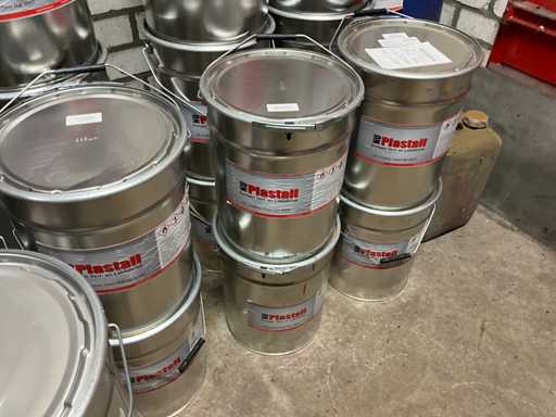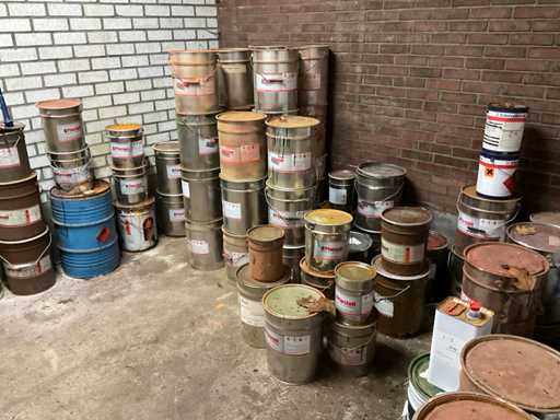 alle emmers met coating uit 1 ruimte, onder andere RAL 1003/1007/3002/5017/6002/6020/7003, diverse onaangebroken en aangebroken 20 Ltr emmers,