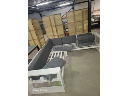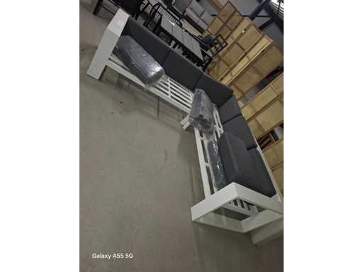 Deze loungeset bestaat uit een ruime hoekbank voor buiten, gecombineerd met een salontafel van aluminium. De set wordt geleverd exclusief zitkussens, inclusief alleen rugkussens. Let op: de afbeelding kan afwijken van het origineel.