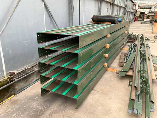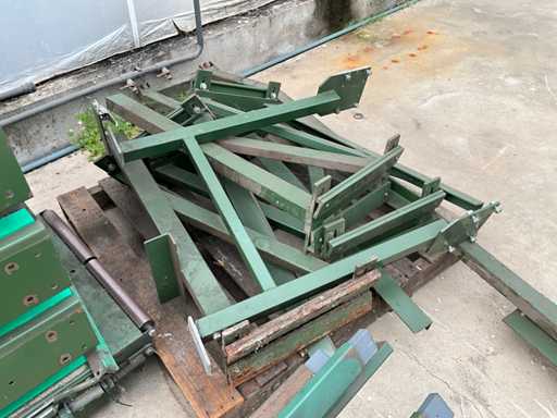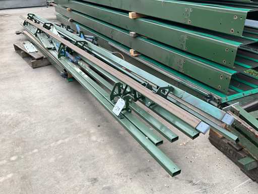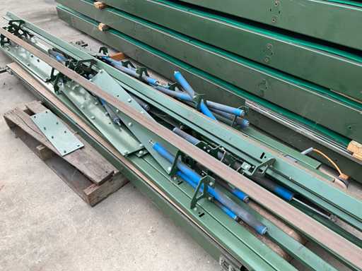 Bestaande uit 5 frames lengte 600 cm; 1 frame 180 cm; transportband 300x70 cm; pallet met staanders; geleideprofielen en rollen. voorzien van trommelmotor De band ontbreekt.