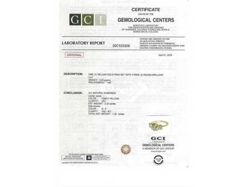 Gorgeous Luxury Ring Natural Fancy Yellow Diamond 3,22 karaat in 14k witgoud, totaalgewicht 2,90 gr. met een grote natuurlijke fancy yellow diamond ronde briljant slijpvorming, zeer goede zuiverheid VS1 van 2,22 karaat met 2 ronde briljante diamanten, kwaliteit D-F / VS2-SI1 van 1,00 karaat. Gecertificeerd door GCI Laboratoire, een van de grootste internationale certificerings- en evaluatieinstituten voor diamanten en edelstenen. Meer informatie zie het certificaat. De sieraden zijn in werkelijkheid beter dan de foto's. Schattingsprijs van de winkelier: 47.850.-