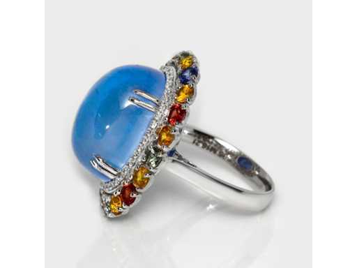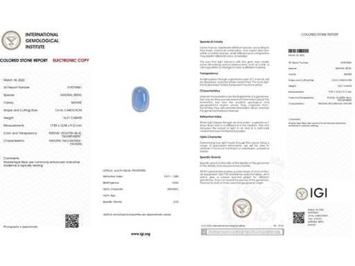 Magnificent Design Ring Natural Berly Intense Blue 19,29 karaat in 14k witgoud 9,55 gr. met een Natural Berly Intense Blue 16,21 karaat, 40 ronde briljante natuurlijke diamanten F-G / SI van 0,31 karaat en 20 ronde natuurlijke saffieren eye clean 2,33 karaat. Gecertificeerd door IGI, een van 's werelds grootste onafhankelijke edelsteencertificerings- en taxatieinstituten. Meer informatie zie het certificaat. De sieraden zijn in werkelijkheid beter dan de foto's. Winkelprijs: € 14.450.-