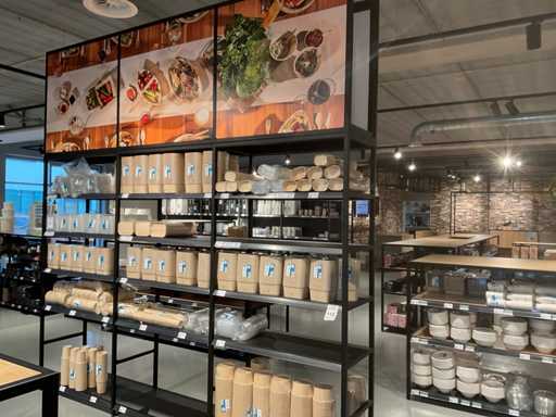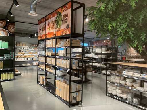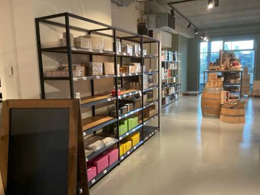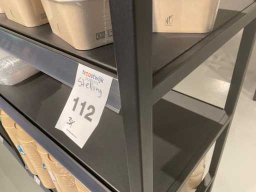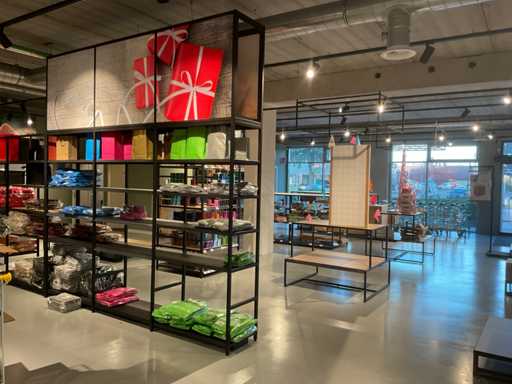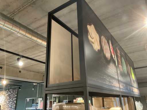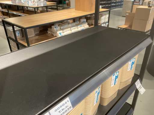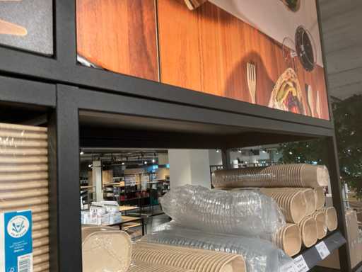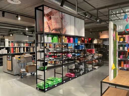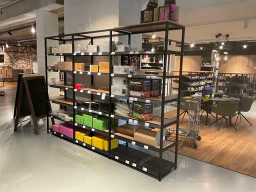 3 Presentatiemeubels, 1 meubel bestaat uit 2 vaste delen van ca. 100x222x50 cm met tussenbalken en/of planken, 2 displays v.v. verhoging van ca. 312x100x50 cm, grotendeels met zwart metalen legborden, deels houten legborden.