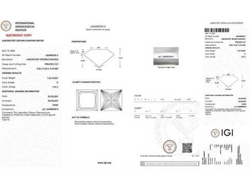 Certificaat & Specificaties: Deze labgegroeide diamant wordt geleverd met een officieel IGI-certificaat en rapport, wat de kwaliteit van de diamant garandeert. Bekijk het cerficaat dat bij de foto's staat of raadpleeg bovenstaande tabel voor de gedetailleerde diamant specificaties. Alle vermelde kenmerken zijn rechtstreeks overgenomen uit het bijhorende IGI-rapport. Wat is een labgegroeide diamant? Een labgegroeide diamant is een diamant die in een gecontroleerde laboratoriumomgeving wordt geproduceerd met behulp van geavanceerde technologie. Hij bezit dezelfde chemische, fysieke en optische eigenschappen als een natuurlijke diamant, maar wordt vervaardigd zonder mijnbouw. Labdiamanten vormen daardoor een duurzaam en ethisch alternatief en worden gecertificeerd volgens dezelfde kwaliteitsnormen als natuurlijke diamanten.