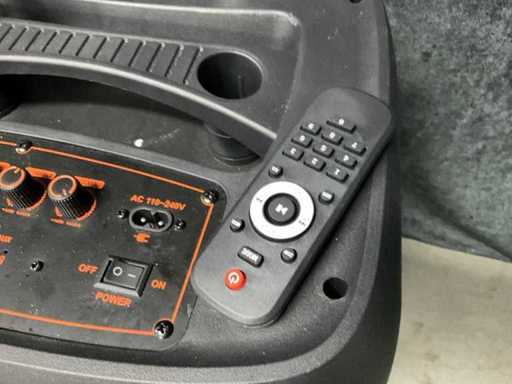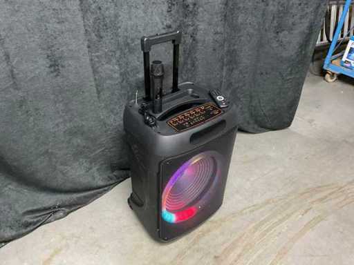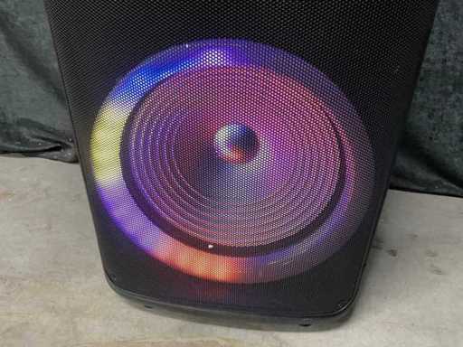 Ingebouwde accu, LED verlichting (werkt half), Bluetooth, USB, 1 draadloze microphones, laadkabel, 15 inch woofer, 400 Watt.