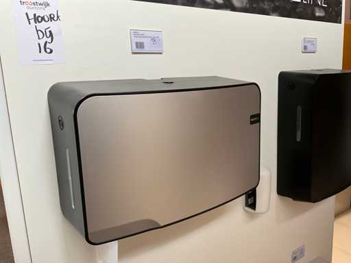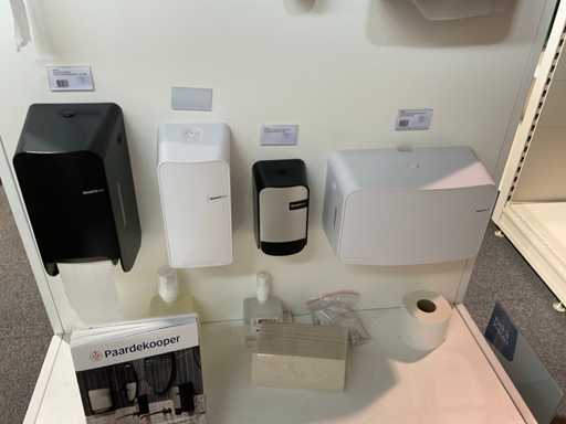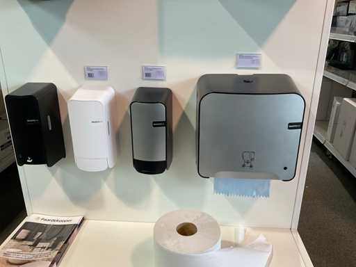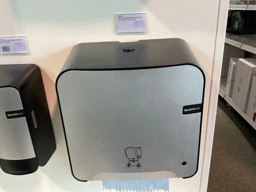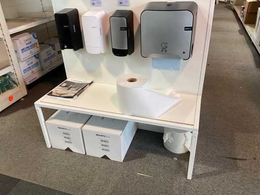2 stellingen met diverse samples van Quartzline o.a. toiletroldispenser, handdoekdispenser, zeepdispenser, poetsroldispenser en luchtverfrisser, inclusief stelling. Inclusief winkelstelling.