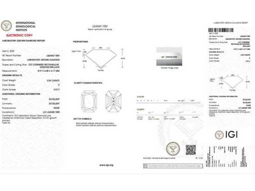 Deze labgegroeide diamant wordt geleverd met een officieel IGI-certificaat en rapport, wat de kwaliteit van de diamant garandeert. Bekijk het cerficaat dat bij de foto's staat of raadpleeg bovenstaande tabel voor de gedetailleerde diamant specificaties. Alle vermelde kenmerken zijn rechtstreeks overgenomen uit het bijhorende IGI-rapport.