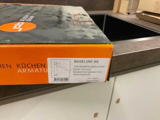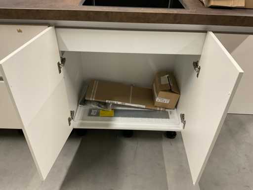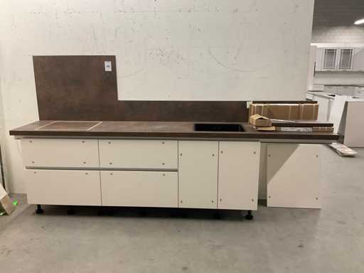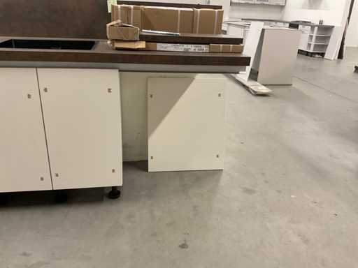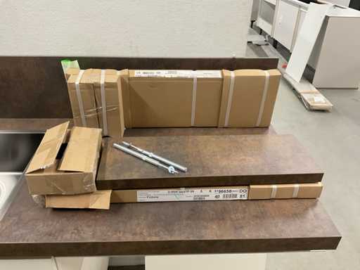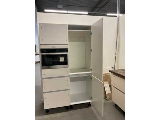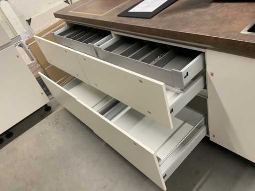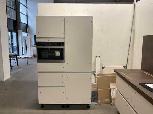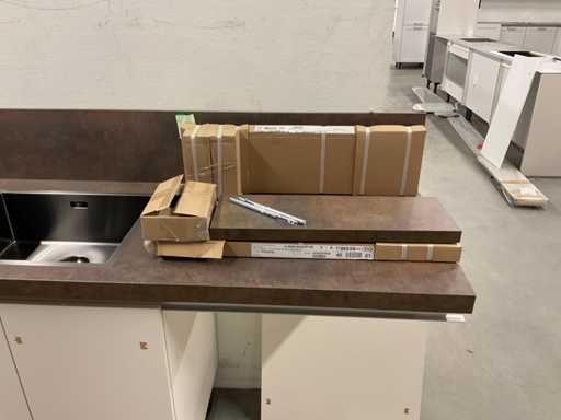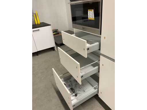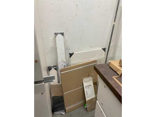 indeling: 1 onderkast; 2 ladenkasten elk met binnenlade; 2 hoge kasten; 2 wandplanken afm. 60x20x3 cm en 70x20x3 cm; deurfront voor vaatwasser; Apparatuur: Whirlpool inbouw combi-stoomoven; type W7MS450; inhoud 29 liter; reeds gedemonteerd en ingepakt op pallets; werkbladen, plinten en hoge kasten niet ingepakt