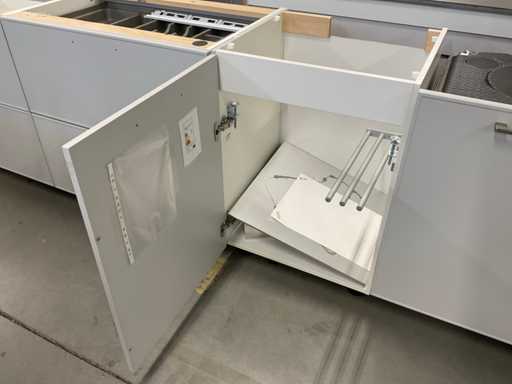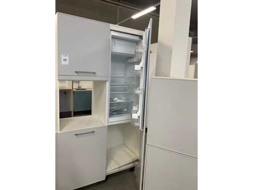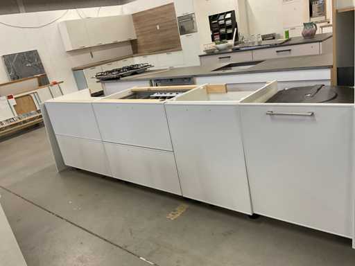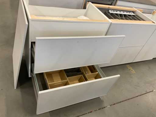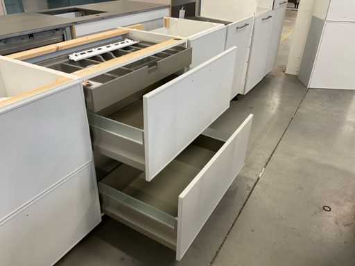 indeling: 1 onderkast; 2 ladenkasten waarvan 1 met binnenlade; 2 hoge kasten; 2 bovenkasten; deels zonder greep; Apparatuur: Siemens inbouw koelkast met vriesvak; type KI24LNFF1; inhoud 183/17 liter; Ataga inbouwvaatwasser; type DW50.1; reeds gedemonteerd en ingepakt op pallets; werkbladen, plinten en hoge kasten niet ingepakt