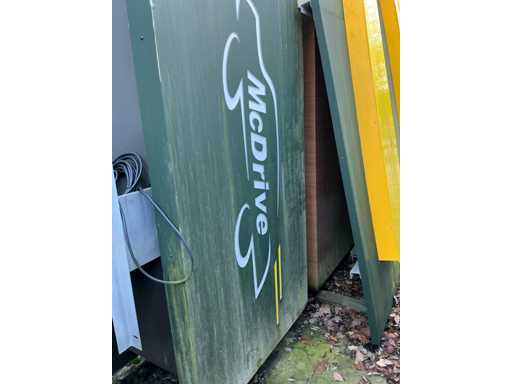Compleet met extra reclamebord Mcdonalds McDrive, afmeting circa. 244x77x565cm en grote metalen reclamezuil, afmeting circa. 1,10x1x 12,9m
