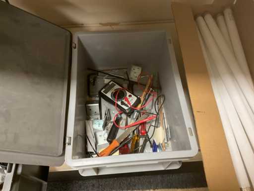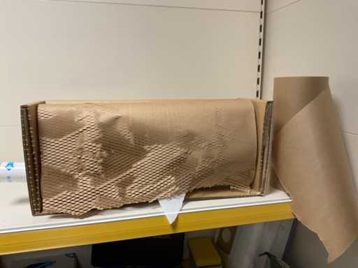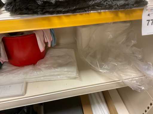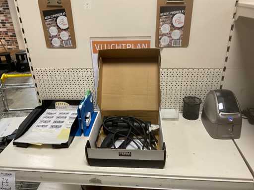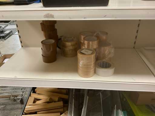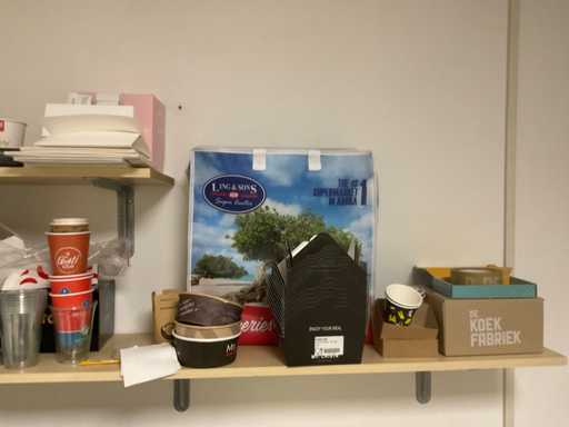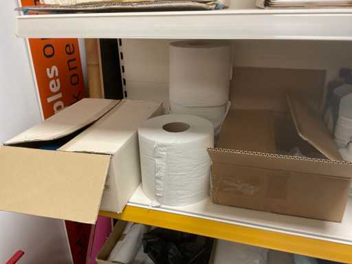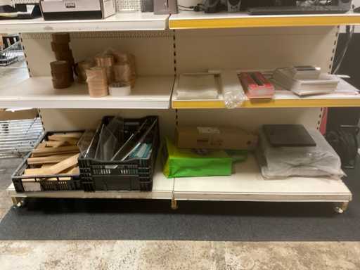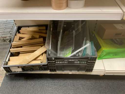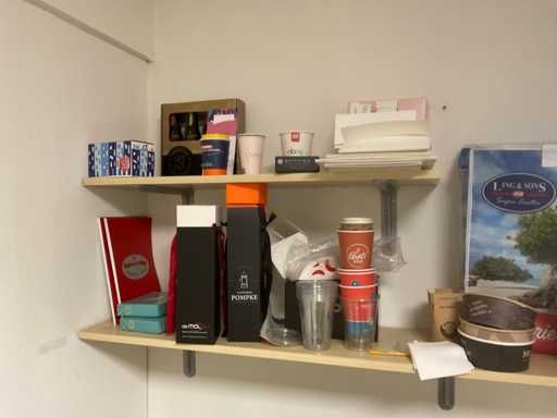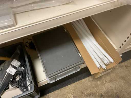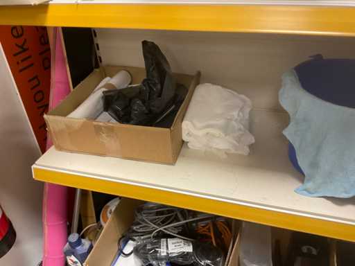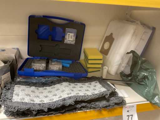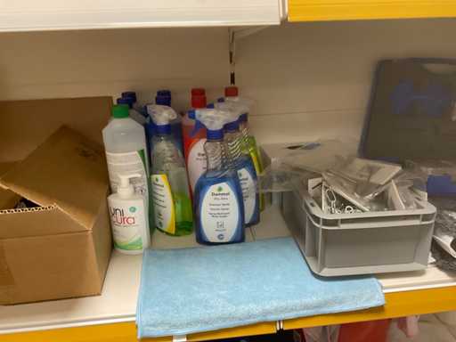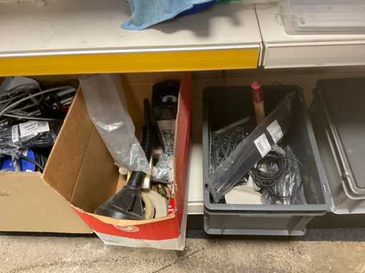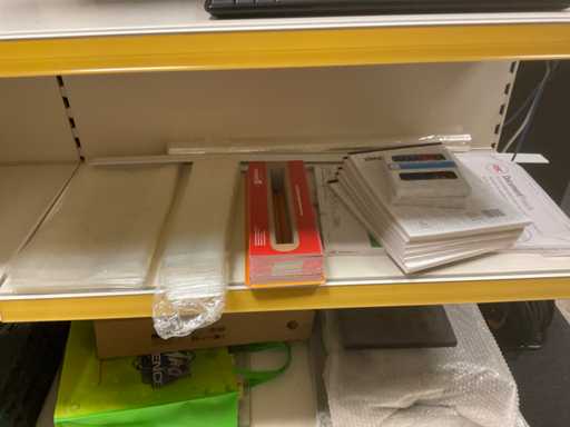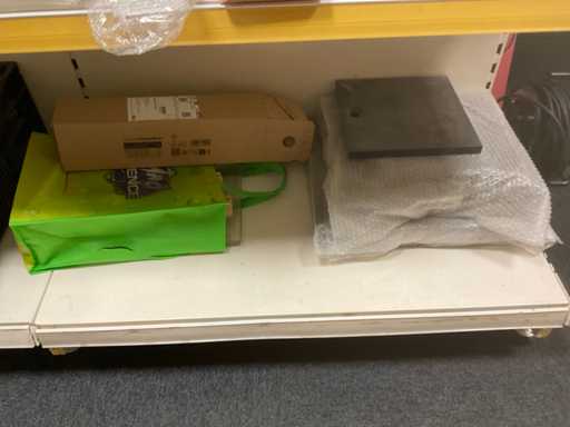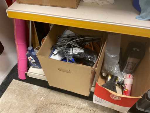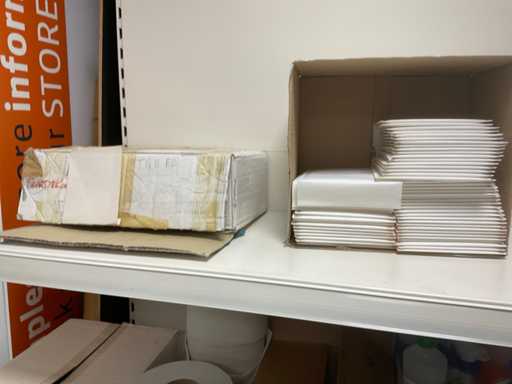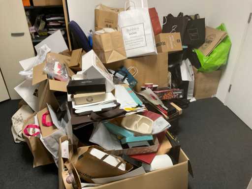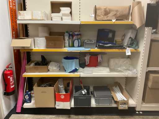 Inhoud van 2 stellingen en kantoorruimte exclusief computers, printer, administratie, buro, kasten en werkkleding bestaande uit o.a. bubbelenveloppen, wrappingpapier, reinigingsmiddelen en materialen, gereedschap, kabels, plakband, voorbeeldtassen uit kantoorruimte, exclusief andere zaken in kantoorruimte en stellingen.