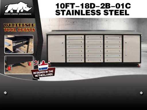 Rhino-Cross-Workbench 10ft-18D-2B-01C RVS Werkbanken 18 lades 2 deuren