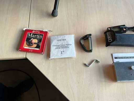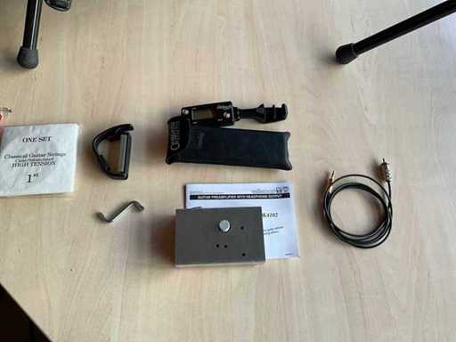 All solid gitaar, inclusief gitaar standaard, muziek standaard, capo, versterker, snaren, opbergtas.