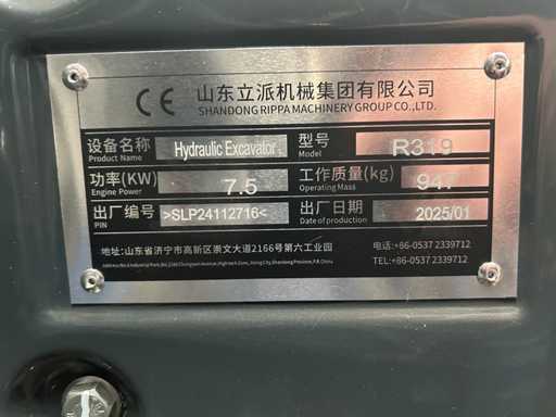 Rippa R10 ECO mini-graafmachine – ongebruikt – 1 ton – uitvoering met zuinige en onderhoudsvriendelijke Yoop-dieselmotor – vermogen ca. 8,2 kW (~11 pk) – brandstofverbruik ca. 0,8–1,2 L/u – werkgewicht ca. 970–1000 kg – maximale graafdiepte 1833 mm – graafhoogte 3021 mm – graafradius 3233 mm – uitworphoogte 2247 mm – loopsnelheid tot 1,8 km/u – smalle bouw, slechts ± 84 cm breed – 2 hydraulische ventielen doorgetrokken tot aan het einde van de arm – open machine met afdak (ROPS) – hydraulisch duwblad voorzien – snelwisselsysteem gemonteerd – hydraulische klem aanwezig – rupsverbreding voorzien (uitschuifbare onderwagen) – standaard geleverd met 30 cm tandenbak – bediening via zijhendels – noodstop en veiligheidsslot aanwezig – ideaal voor kleine ruimtes, tuinen, stegen, binnenplaatsen – CE-gekeurd – compact, krachtig en veelzijdig inzetbaar