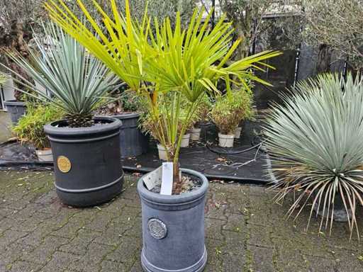 Robuuste henneppalm (Trachycarpus) in een decoratieve plantenbak